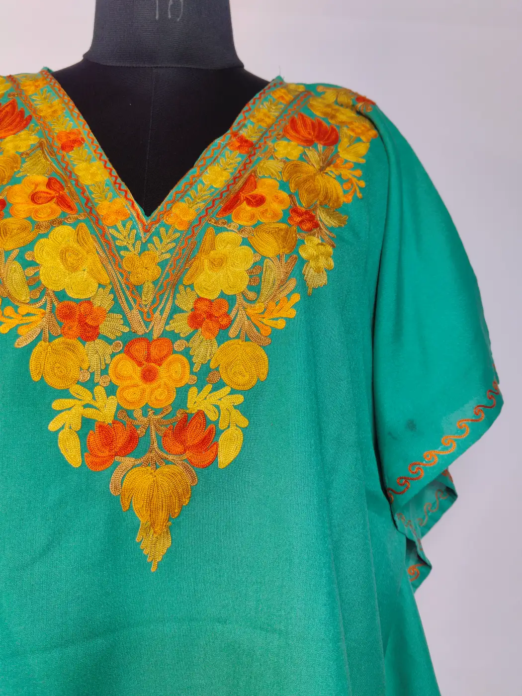 Pine green summer cool cotton gives this Kashmiri kaftan dress a soft flowing form, while aari embroidery decorates the neckline in continuous floral motifs. It carries a simple yet graceful look with light traditional detailing.