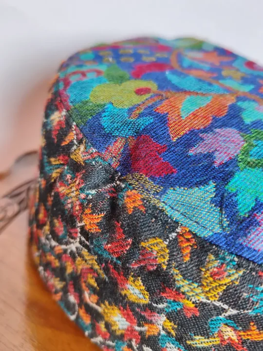 Crafted in black Kani shawl weaving, stylish caps reflect Kashmiri heritage with fine woven patterns. It caps offer two colors, blue at top and black across borders and it features all over floral work.