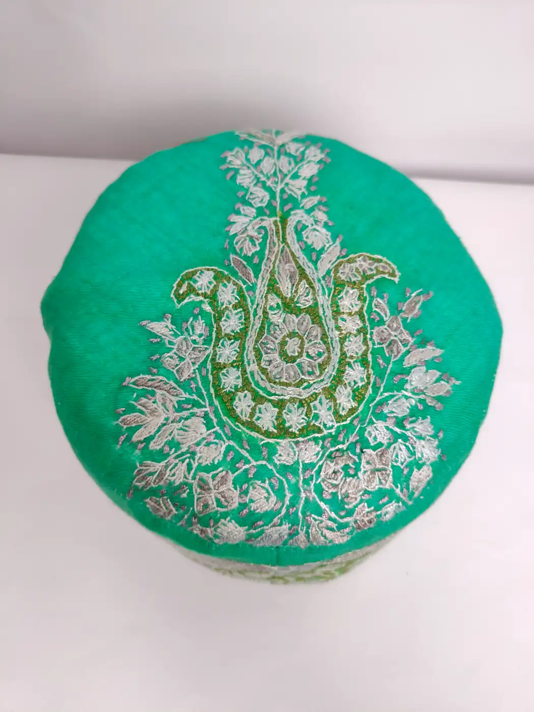 This designer Kashmiri cap is made from blue MP pashmina. It features delicate hand sozni embroidery throughout. Continuous floral motifs appear across the borders while the crown carries a large paisley pattern, giving this cap refined Kashmiri appeal.