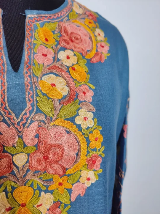 Prepared in ruby cotton for routine wear, this dark grey colour best kurta carries aari embroidery at neckline in floral motifs. It comes in 44 inches chest size and 41.5 inches length, ensuring comfortable wear