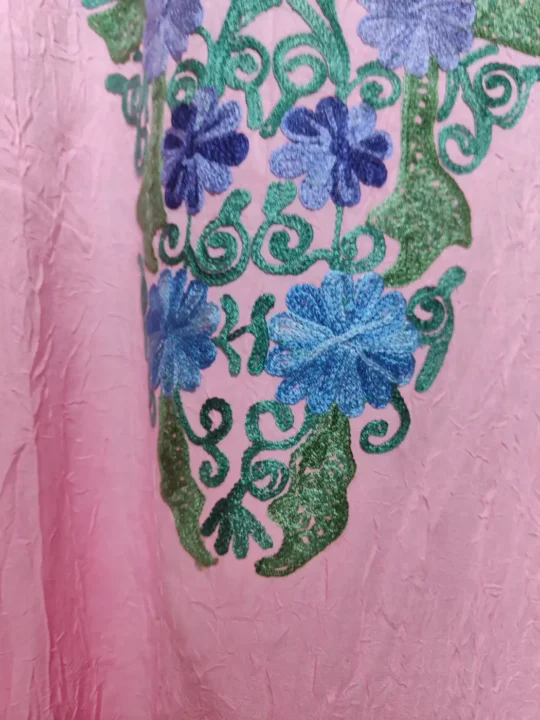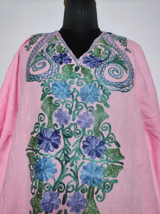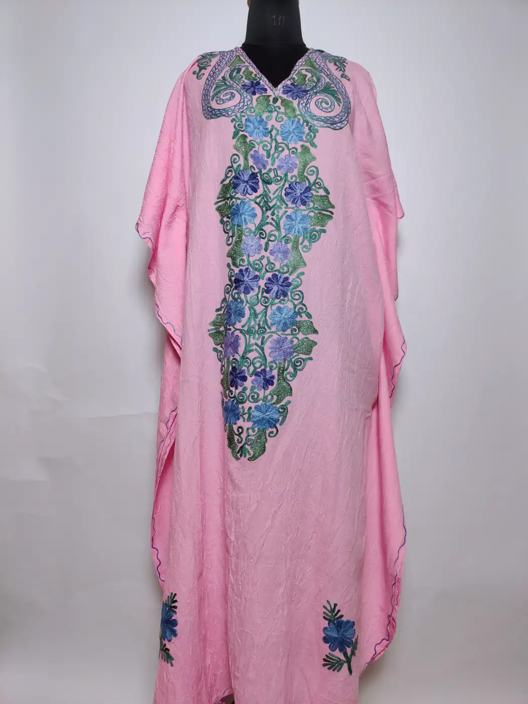 Floral embroidery at the neckline extended to the front panel adds a delicate touch to this Kashmiri aari work kaftan dress. Made from pink colour crush cotton, it gives you a comfortable outfit that blends everyday ease with a touch of traditional detailing.
