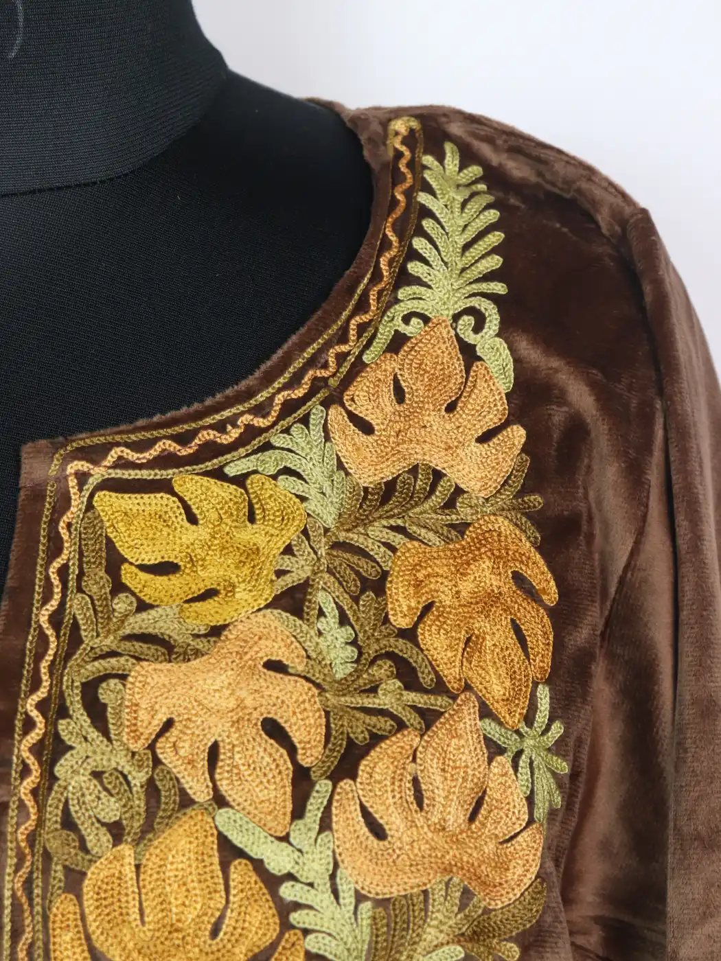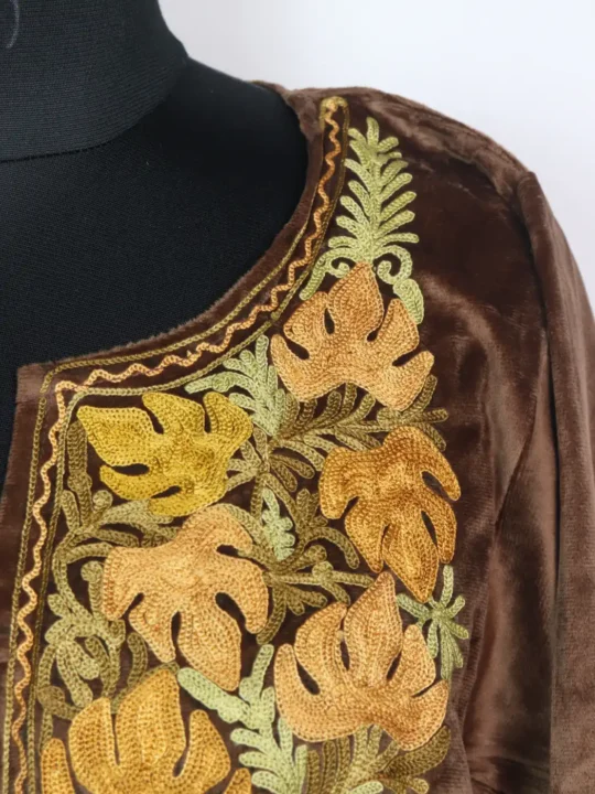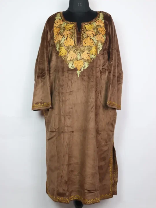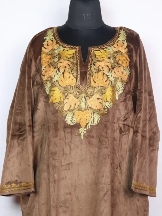 A warm elegant brown velvet base makes this pheran feel like a safe little nest. The neck has chinari aari detail, and the 58 chest with 45 length creates a loose fit with two side pockets. Perfect for mornings and long winter evenings. Soft, steady warmth.