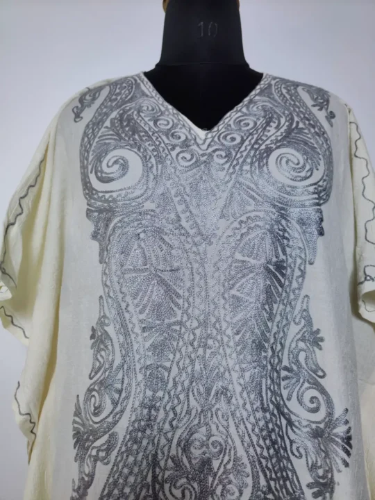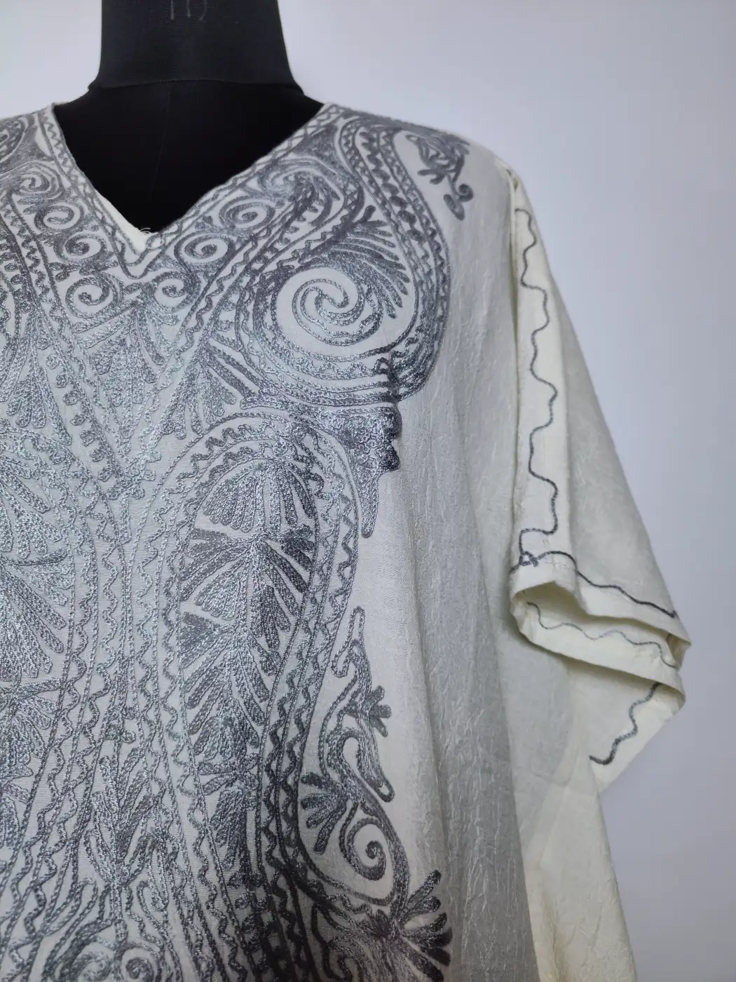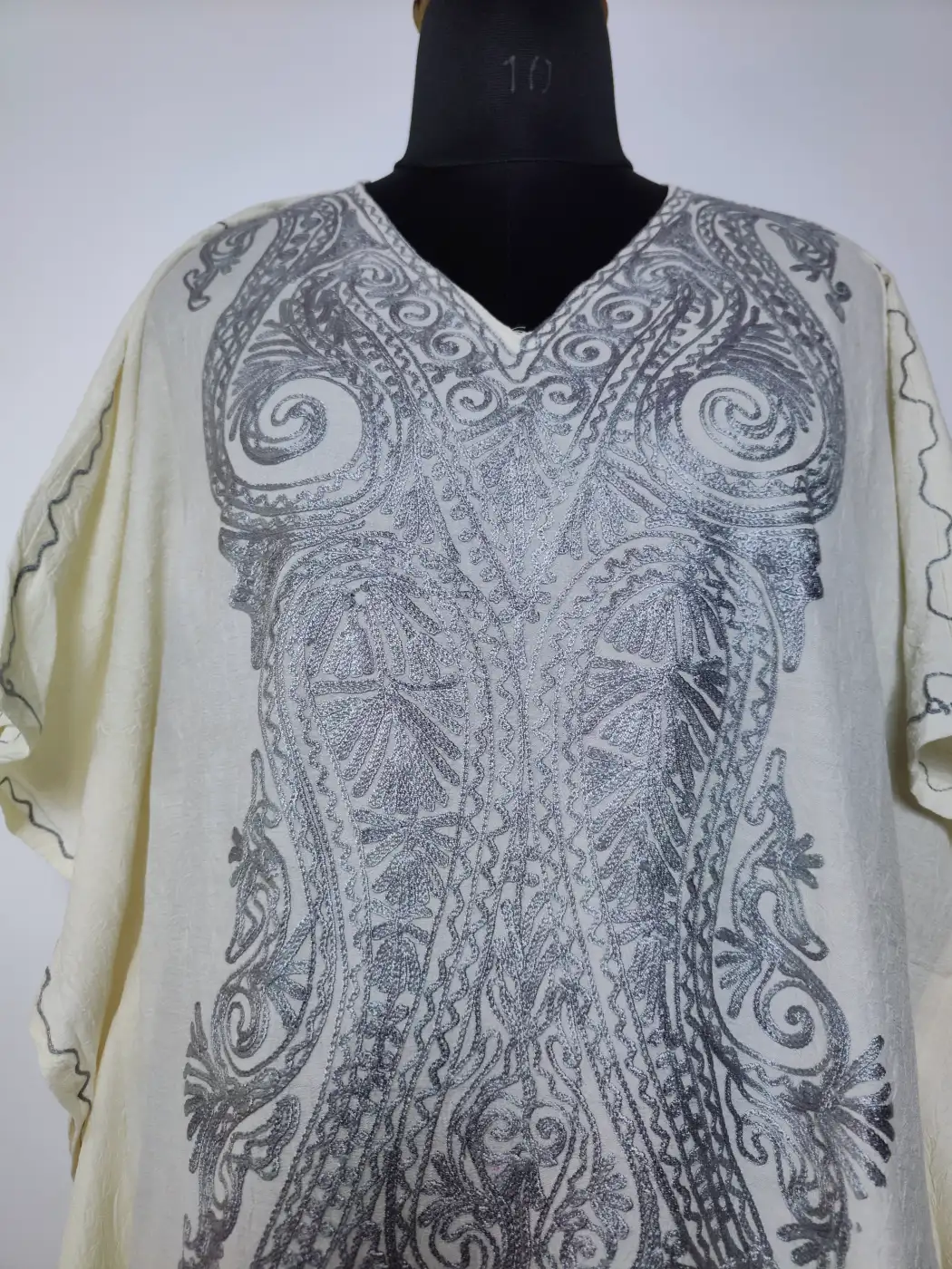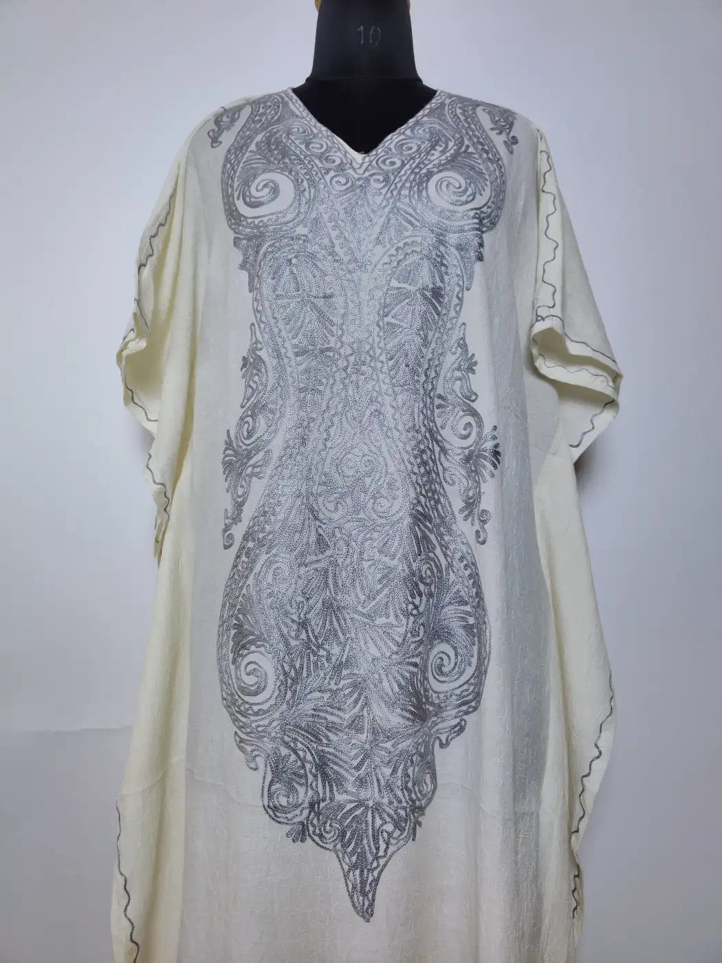 Light and breathable, this Kashmiri aari work kaftan is made from white crush cotton for summer. The neckline features large floral embroidery in aari work, adding touch of detail while keeping the overall look fresh.