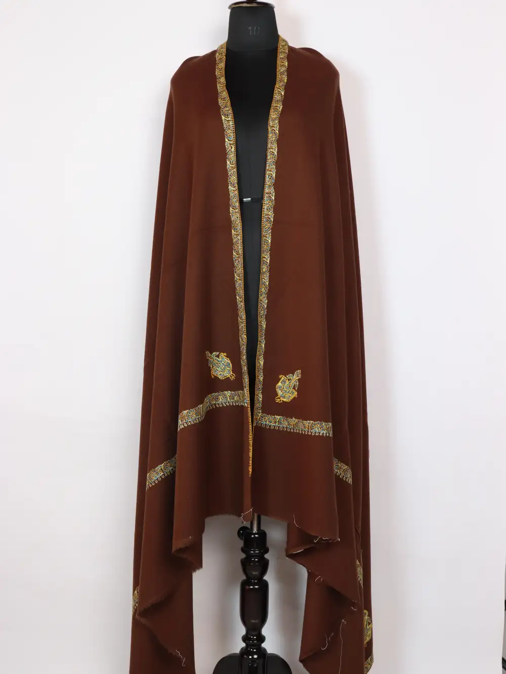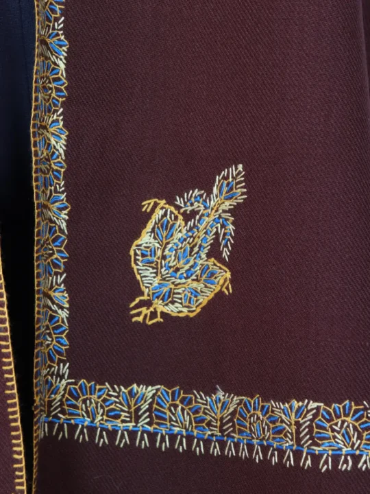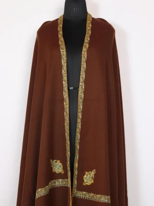 A refined men’s Cashmilon Wool shawl with Hand Sozni running continuously along the border and floral motifs at all four corners in yellow and blue-hued threads. This brown cashmere Kashmiri handcrafted Shawl reads traditional and formal, suitable for functions and programs.