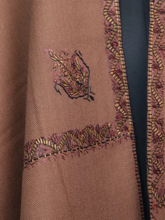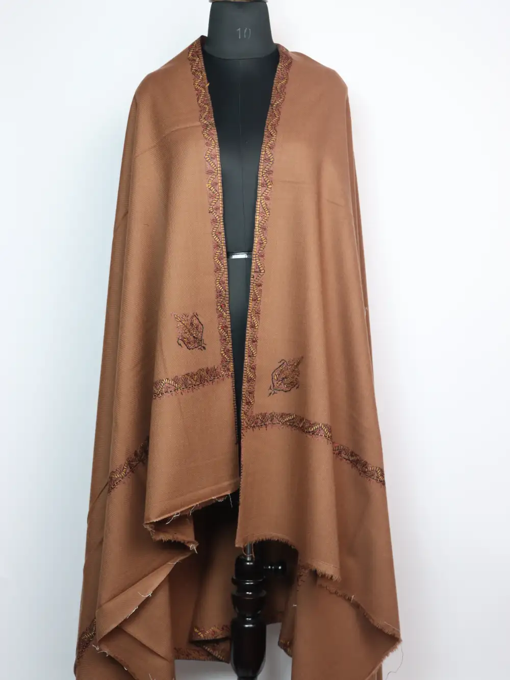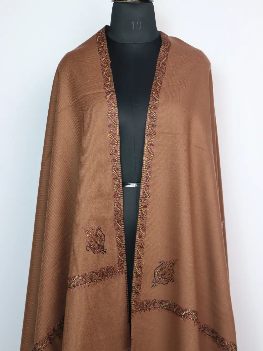 This Rust Brown shawl has a soft cashmilon wool feel with hand Sozni work with the border and small floral touches on the sides. The design is classic and elegant, easy to pair with formal or casual outfits.