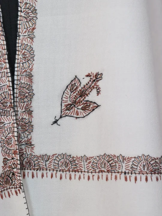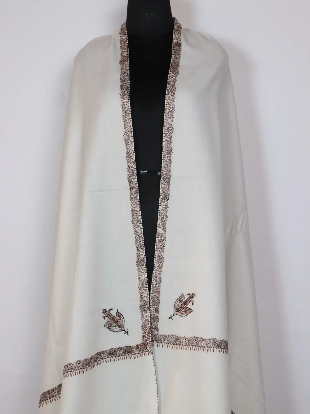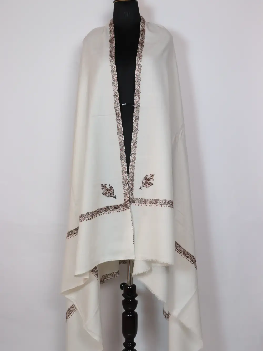Soft white Cashmilon Wool and meticulous Hand Sozni in black and brown threads lend this Kashmiri Shawl an understated elegance — continuous border stitching and floral corner motifs give it a refined finish. It is ideal for men at formal gatherings, you can buy shawls online from our store to choose this handcrafted winter accessor