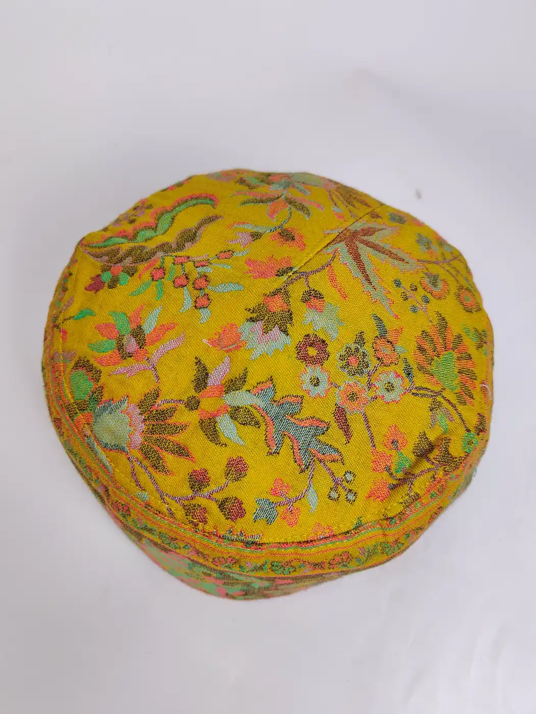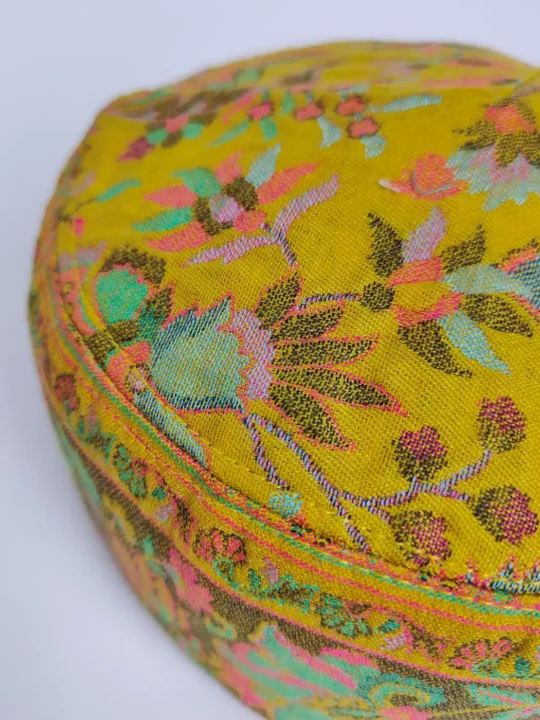 Created in Kani Shawl fabric, this mustard colour stylish cap shows a pleasing profile and smooth finish. Its woven designs present cultural richness and beauty.