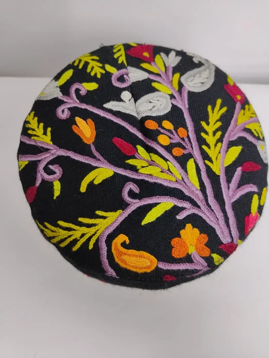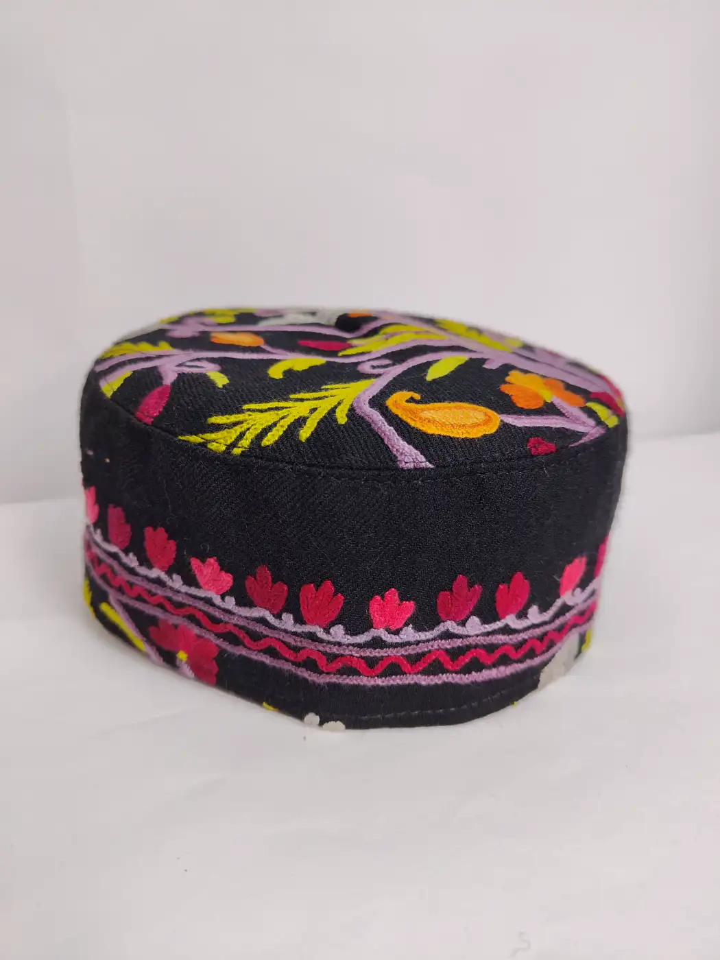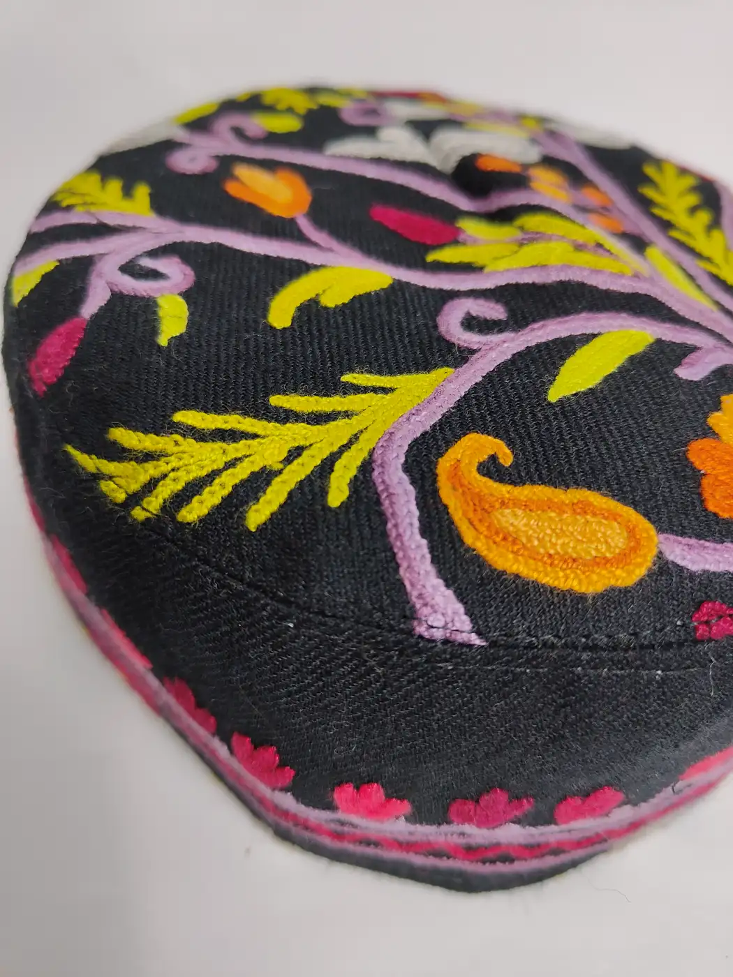 Black pure wool shapes this foldable Kashmiri cap. It is adorned with delicate hand aari embroidery. Floral motifs appear all over the surface with tiny badam patterns scattered between them, which gives this topi refined traditional Kashmiri appeal.