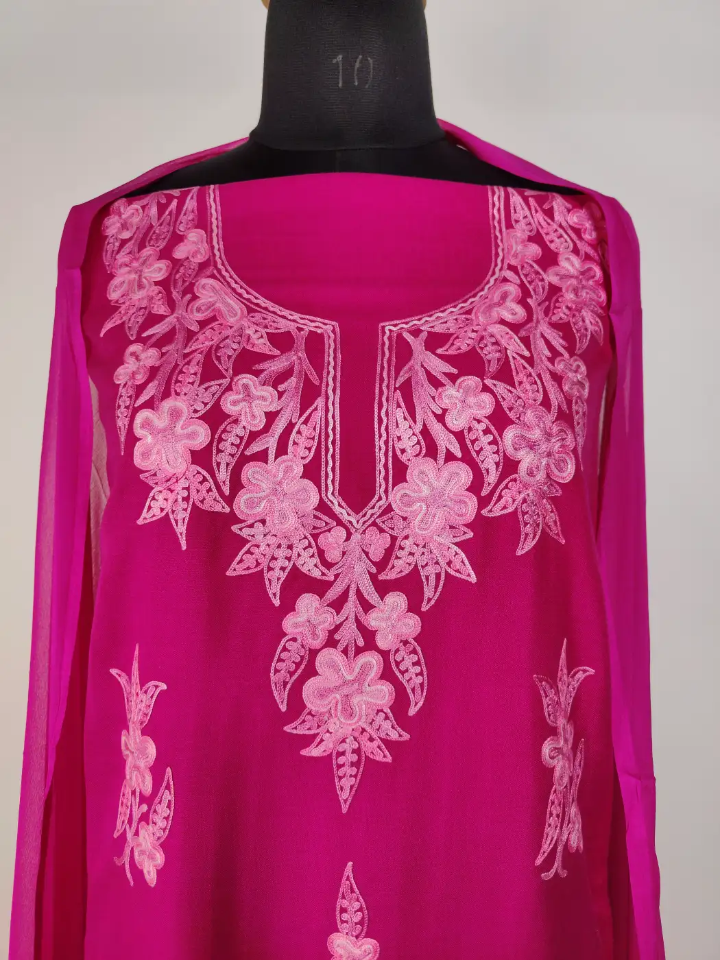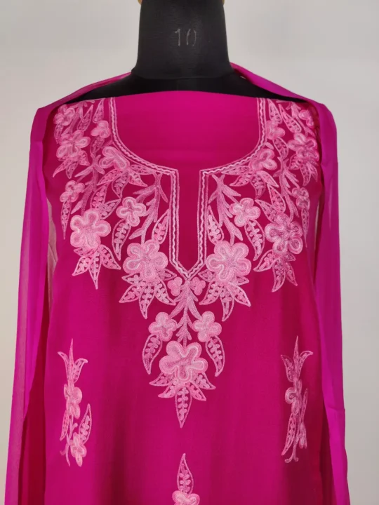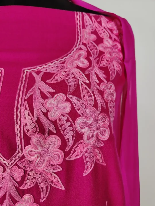 Created in summer cool cotton for summer days, this magenta hue kashmiri work suit showcases Kashmiri aari embroidery in floral motifs at neckline and bootis all over it.. It arrives unstitched so you can tailor the fit, which makes it relaxed and charming daily wear for women.