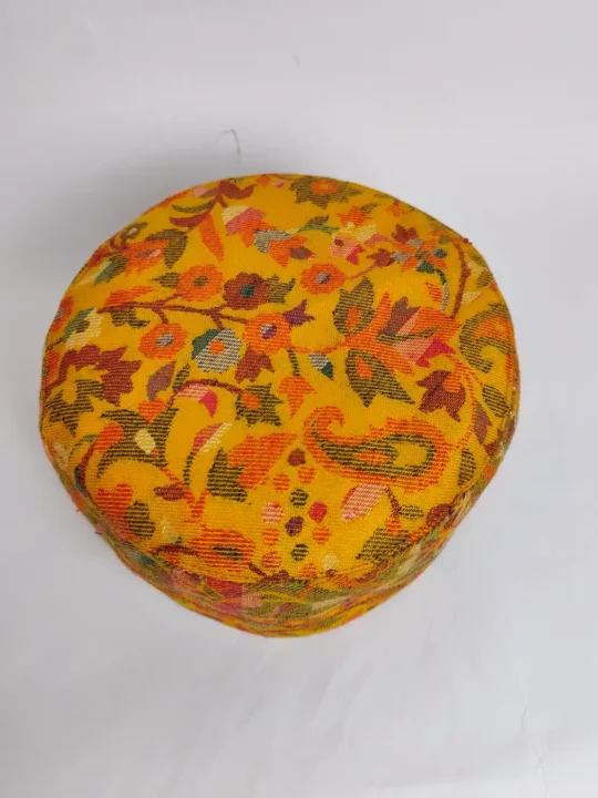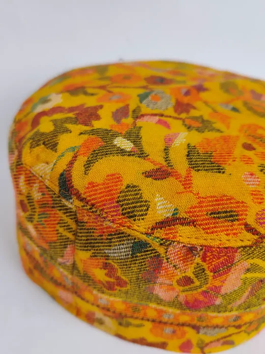 The real beauty here is in the surface of this kani cap. Look closely and you’ll see floral Kani patterns which are flowing all over the mustard base. Since the cap is made from a woven Kani shawl, the design feels deep and refined, not printed. It is a classic topi for someone who appreciates detail without excess.