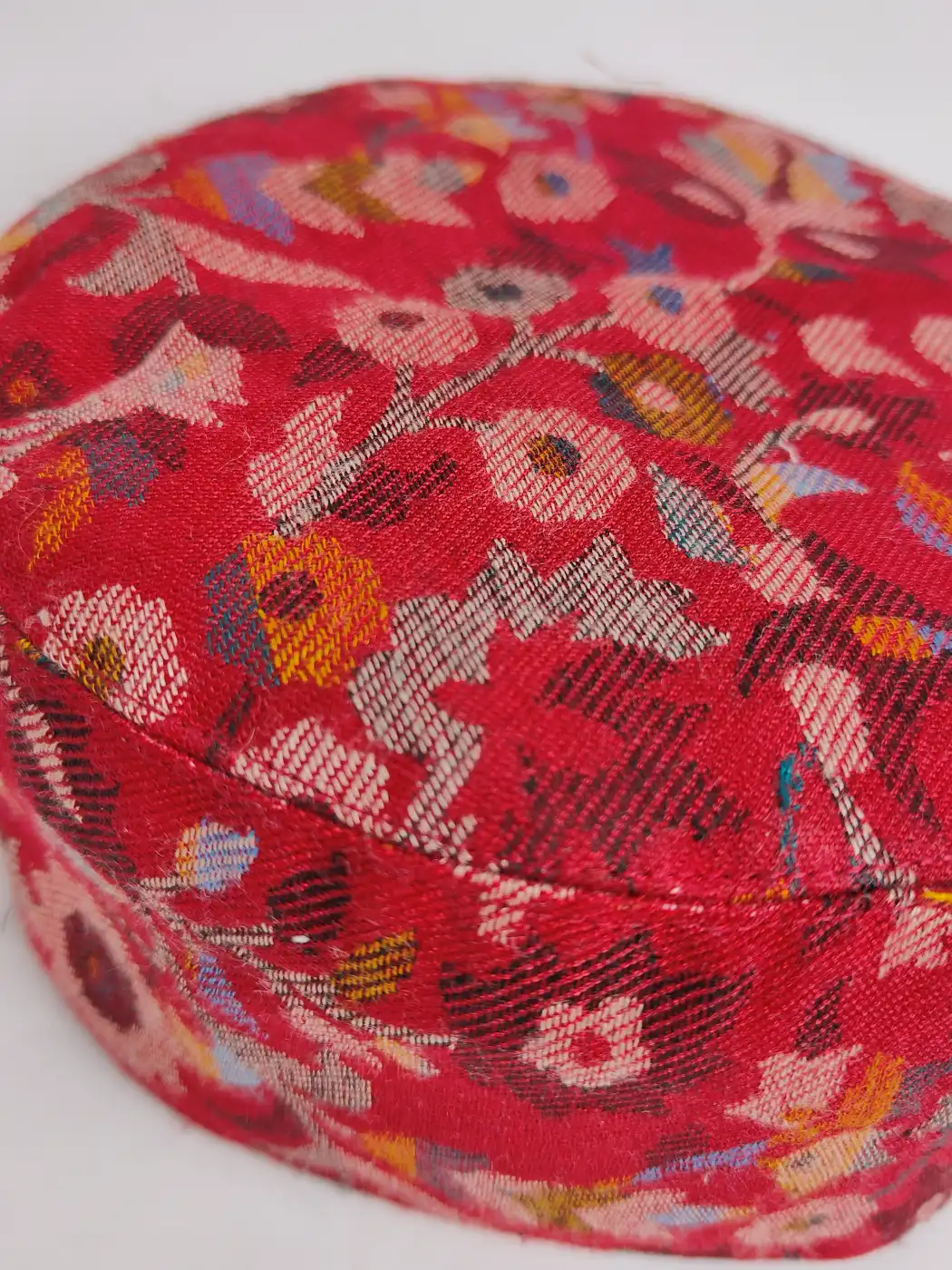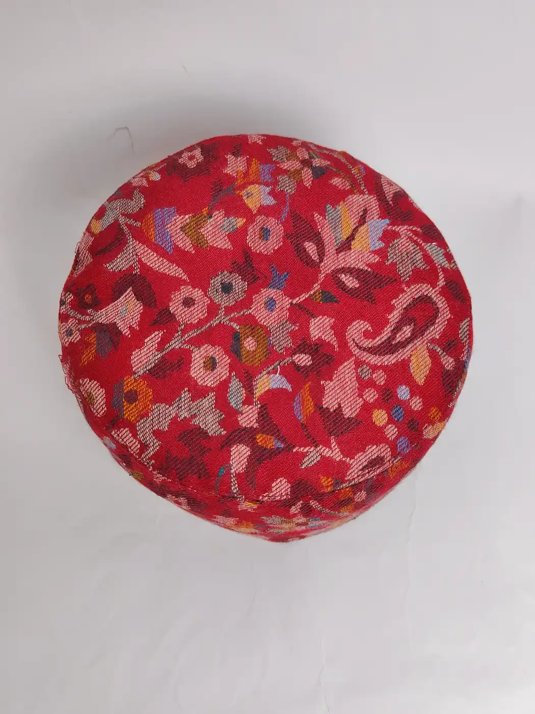 Some pieces don’t shout comfort, they simply carry it. This red kani cap is made from an woven Kani shawl, where floral patterns already live inside the fabric. The richness comes from the weave itself, which gives this topi a calm, dignified presence.