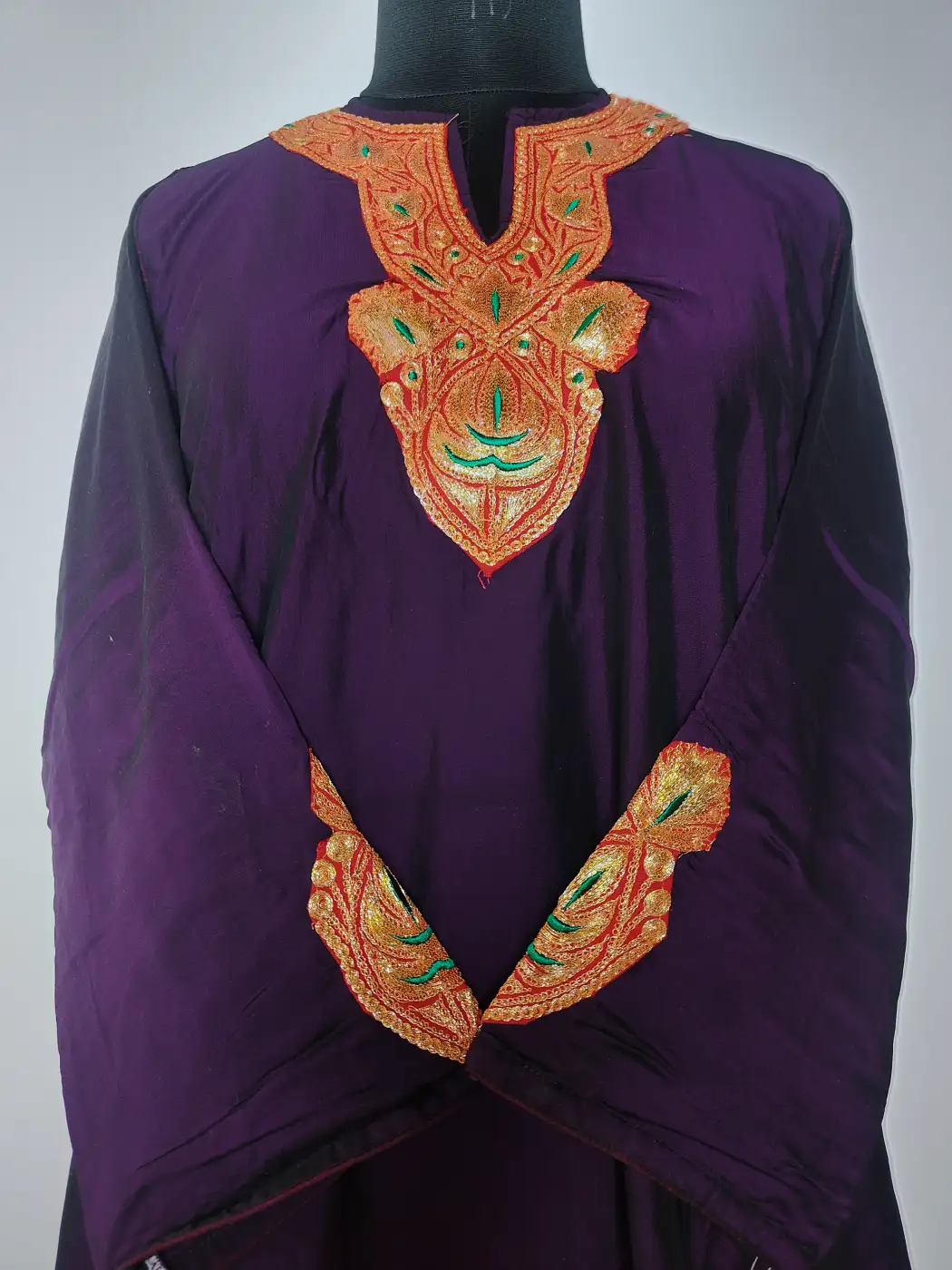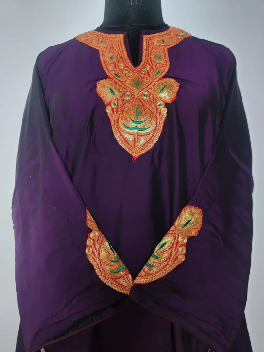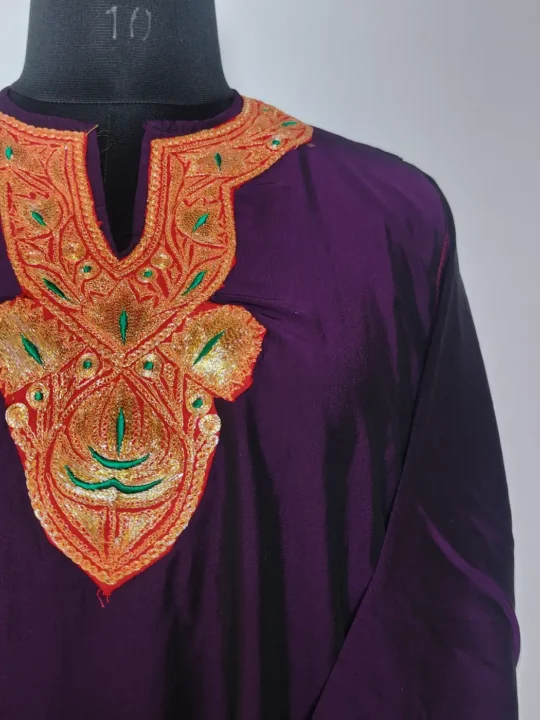 This Kashmiri kurti set turns heads with its wine hue silk and botte tilla work. Floral embroidery defines the neckline and delicate badami booti patterns run along the sleeves. Its fabric and embroidery complete its party-ready look.