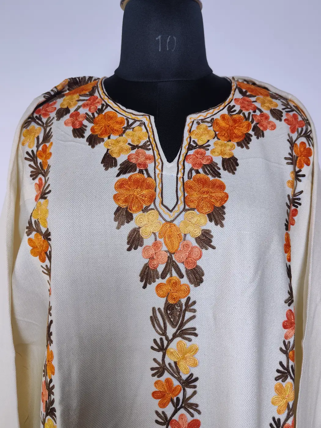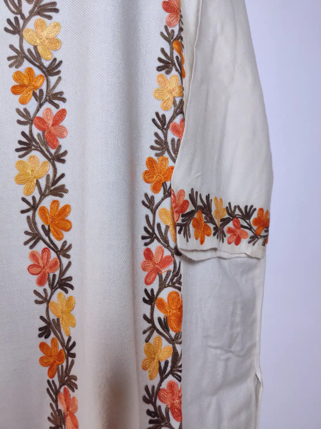 Floral motifs run across the neckline and front panel in lakeer pattern of this kashmiri phiran, that gives it a soft and unique look. Crafted in cream cashmilon wool with aari embroidery, this kashmiri phiran feels warm, simple, and rooted in traditional design.