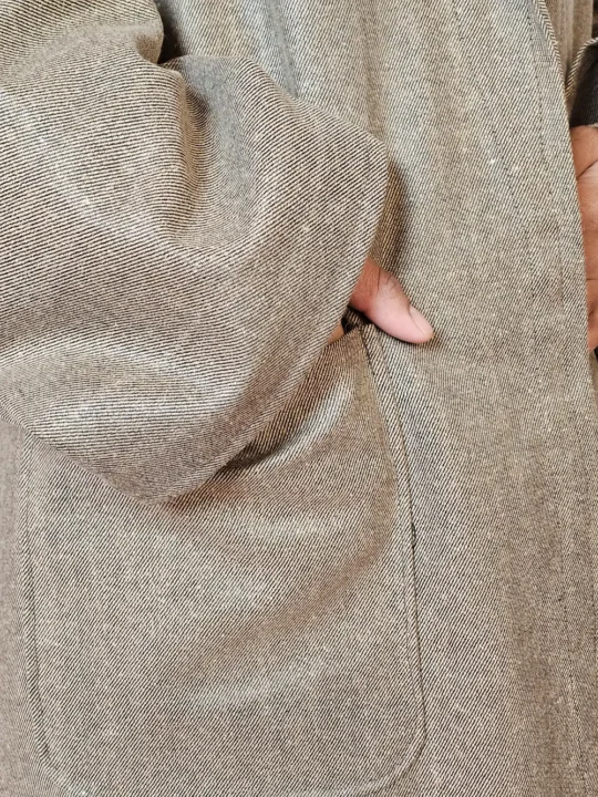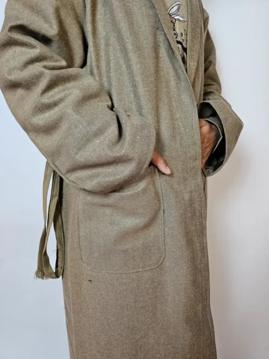Tweed wool light brown gown or bathrobe balances modesty and style with chest size 56 inches and length 48 inches for relaxed fit, and it also includes practical pockets on both sides for daily use. It also includes belt which gives option to fit it according to your own.