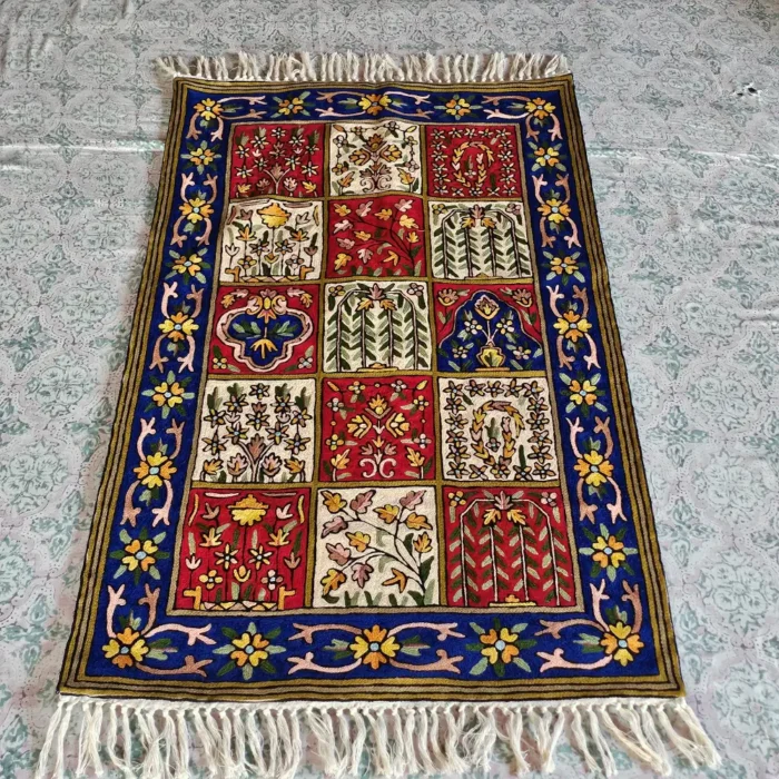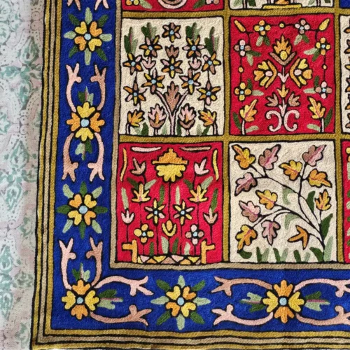 Woven with tradition and detailed by hand, this Kashmiri rug is crafted on dusooty cotton and embroidered using vibrant wool threads in the timeless chain stitch technique. The square motifs reflect the artistic soul of Kashmir flowing florals, rich textures, and a warmth that feels lived in. Whether placed in your living room or at the foot of your bed, it adds both comfort and culture to your home. Made with care in Srinagar