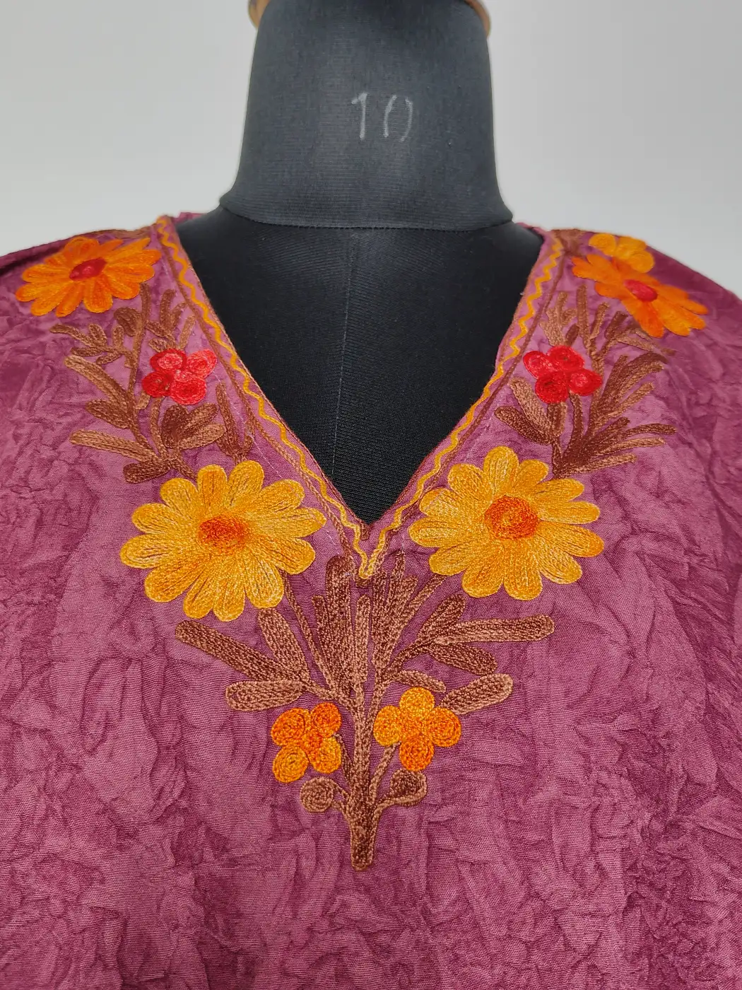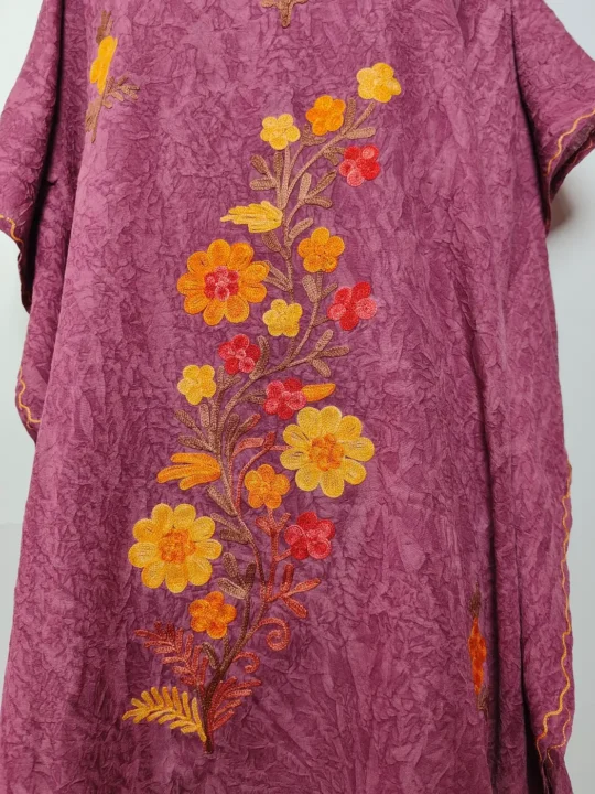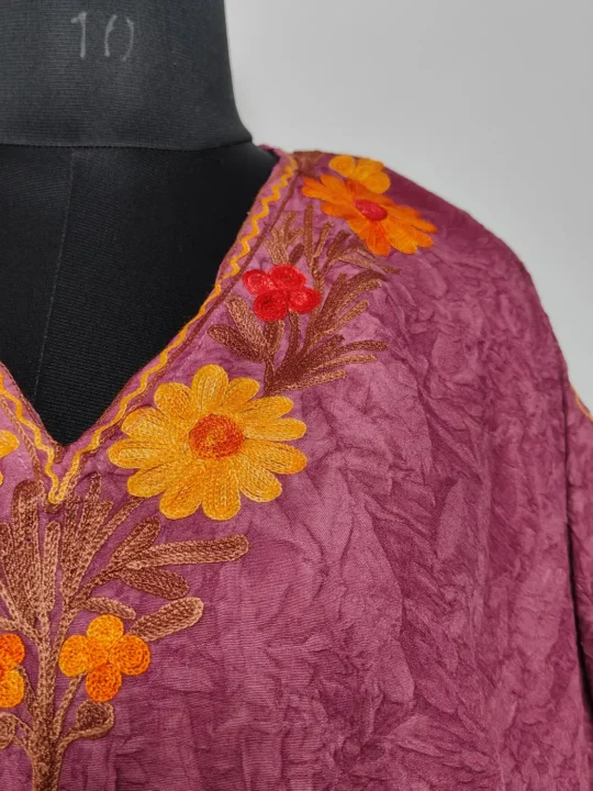 This Kashmiri aari work kaftan is crafted in purple crush cotton and it features fine aari embroidery. The neckline carries floral motifs and front panel features large motif that adds just enough detail while keeping the overall look light, Its beautiful embroidery makes it a comfortable piece for both casual wear and subtle festive moments.