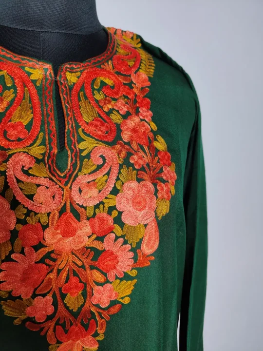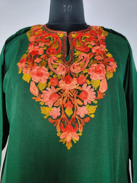This dark green long Kashmiri kurti features delicate floral aari embroidery at the neckline. Made in summer cool cotton, it keeps things light and wearable, offers a relaxed fit that blends comfort with a touch of Kashmiri craft.