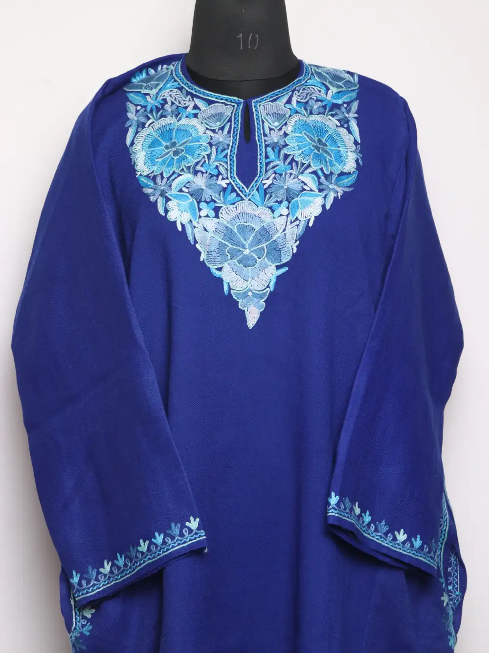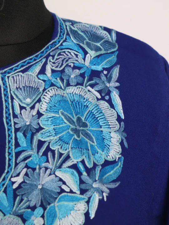 A royal blue plush Raffal Wool kashmiri pheran adorned with hand Aari and paper machie work at the neckline in floral motifs offers elegant handcrafted beauty; It comes in chest 53 inches and length 44 inches that delivers a relaxed and flowing fit.