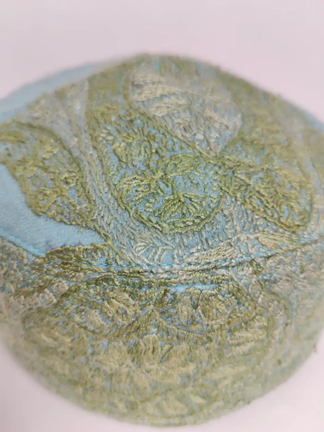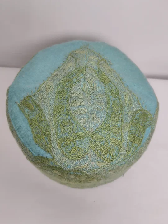 Crafted from white MP pashmina, this sea green cap is adorned with fine hand sozni embroidery. A bold paisley motif decorates the crown while continuous patterns appear across the borders, giving this Topi a refined Kashmiri handcrafted character.