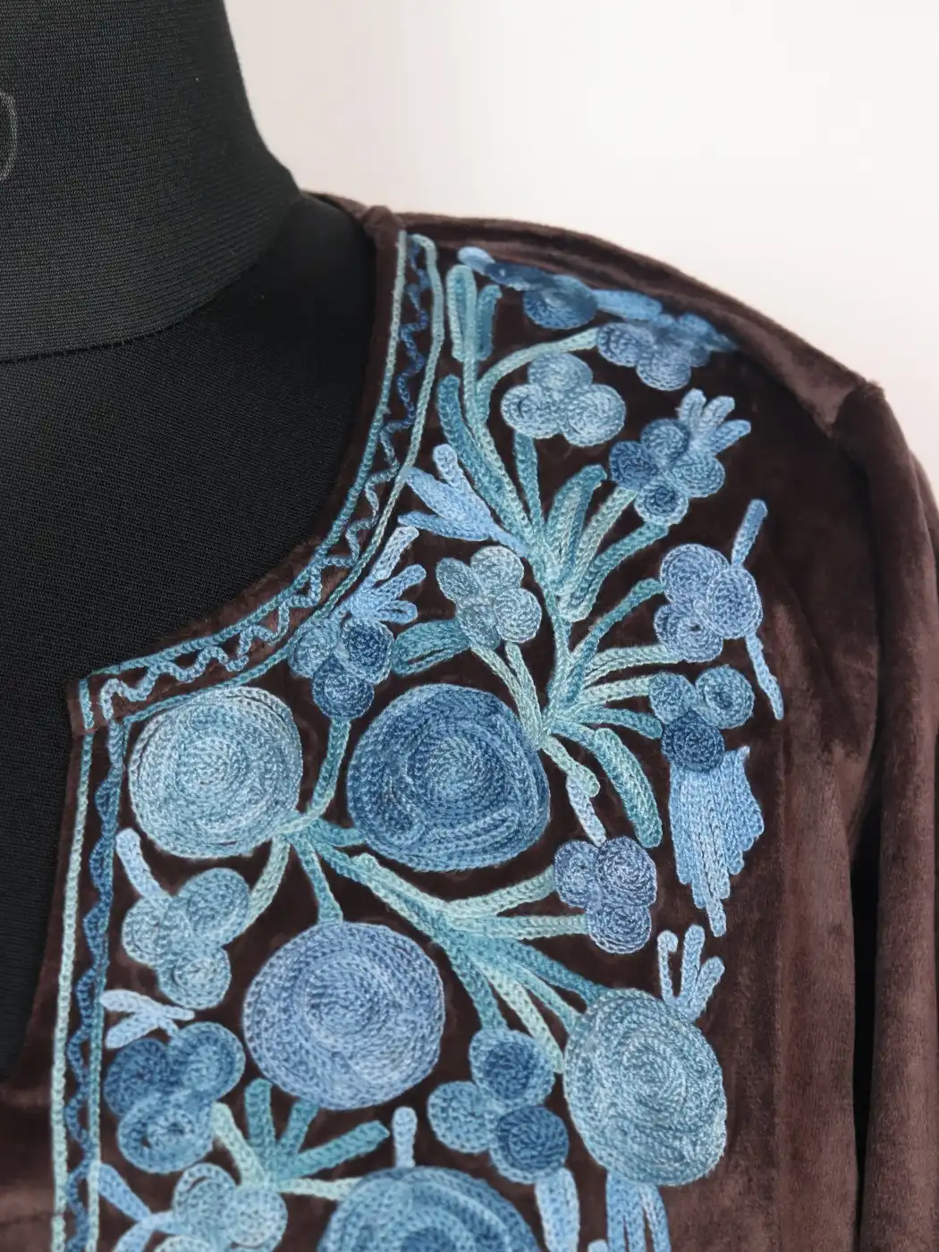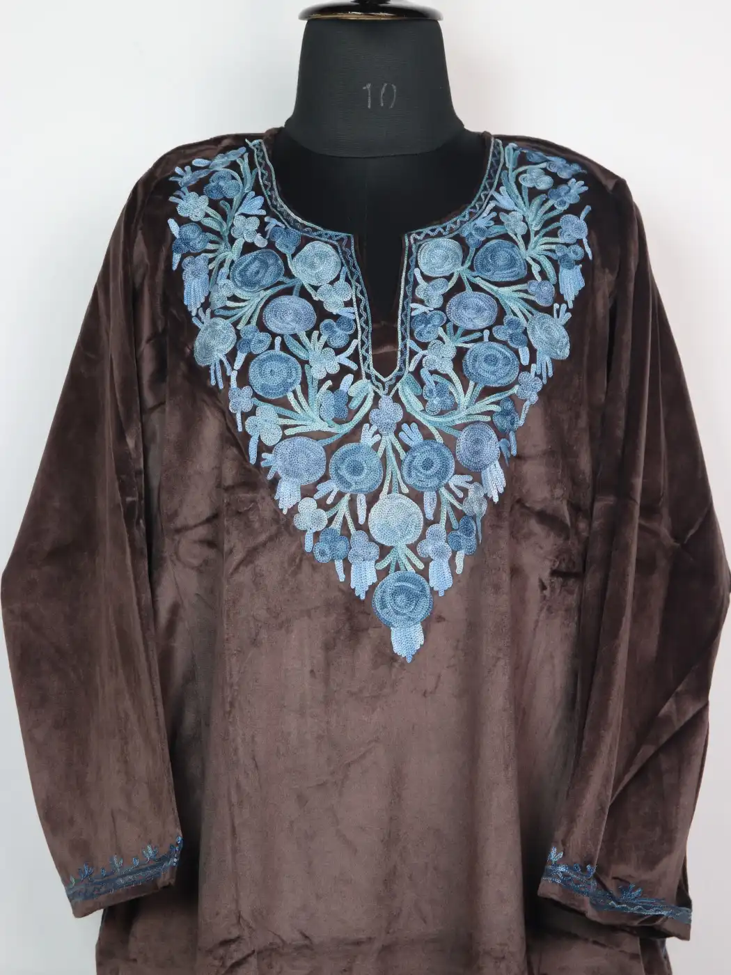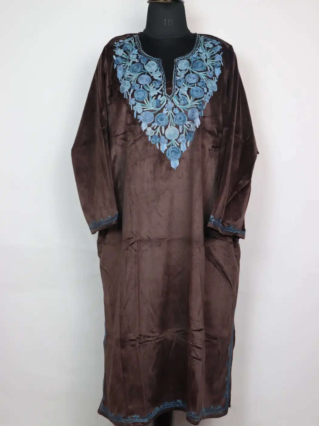 This pheran lets you drift into comfort with its velvet feel. The neckline holds blue floral aari work, and chest 60 with length 45 offers a spacious fit with pockets. It is easy to move in and stays warm all day. A simple and elegant winter choice.