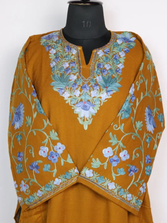 A mustard kashmiri traditional dress in Cashmilon Wool features floral Aari at the neckline and sleeves both side for practical wear. The kashmiri traditional dress stays modest and comfortable, offering a gentle Kashmiri accent at the collar while remaining easy to style.