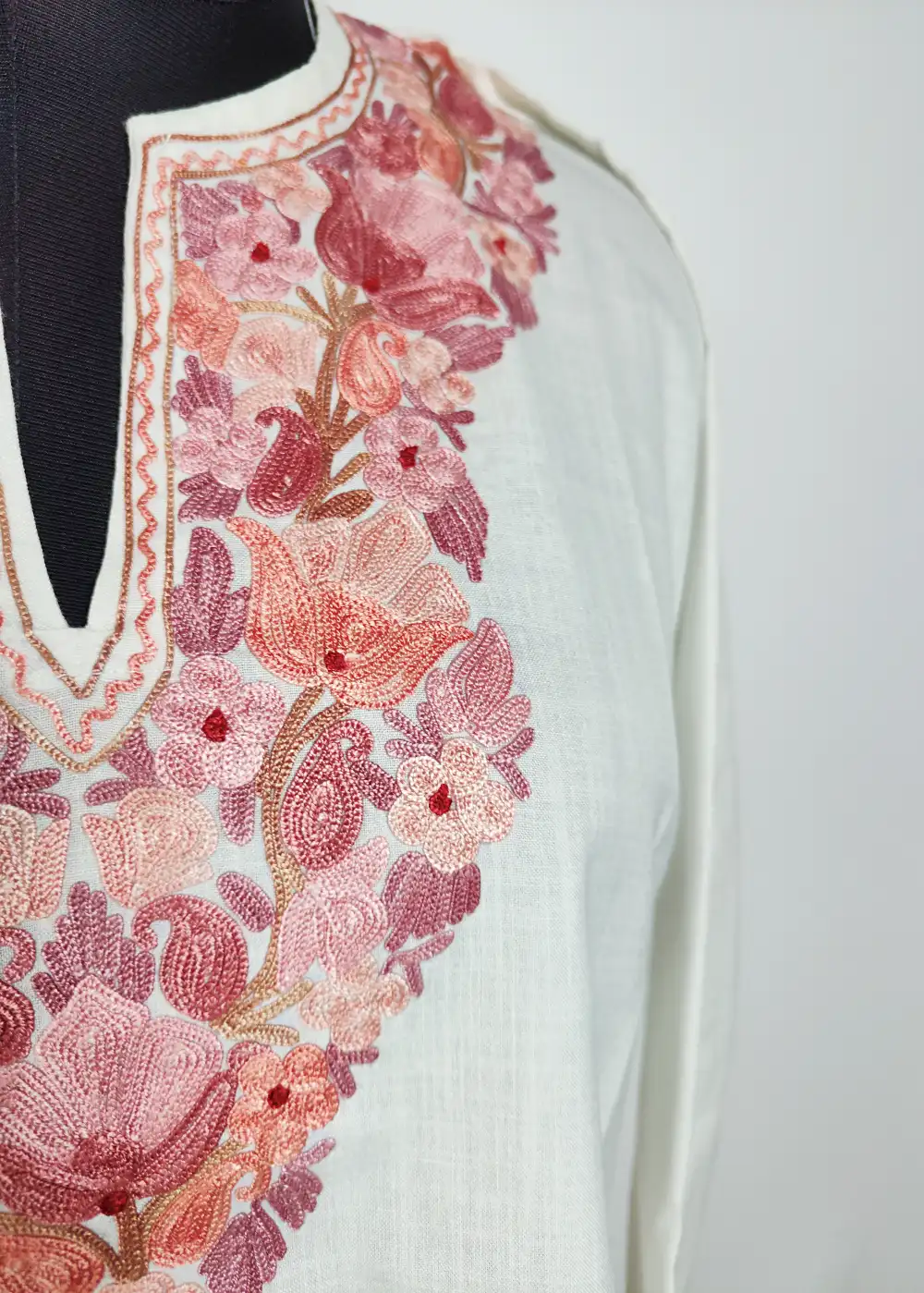This kashmiri work kurti is stitched in ruby cotton that feels soft on the body and easy to carry all day. The neckline has floral aari embroidery that makes the front look elegant and graceful. A good everyday option from best short kurtis online.
