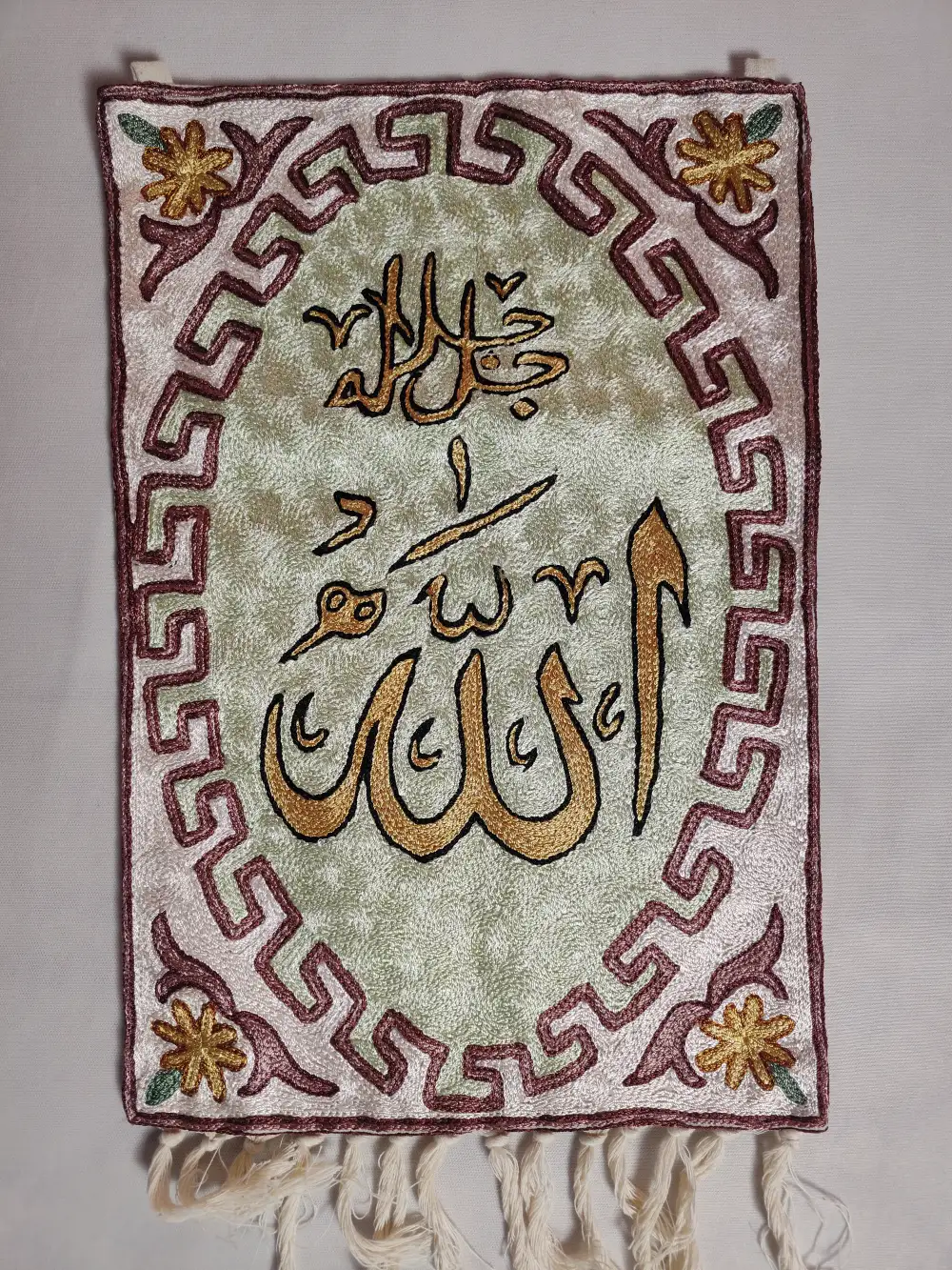 This 1×1.5 feet Kashmiri wall hanging is embroidered on dusoot cotton with silk chain stitch. Its central design carries Arabic calligraphy of the word “Allah,” surrounded by elegant motifs that highlight its form as art rather than devotion. It is a fine choice for framing or wall display, it reflects Kashmiri finesse in using script as design, which makes it suitable for modern interiors.