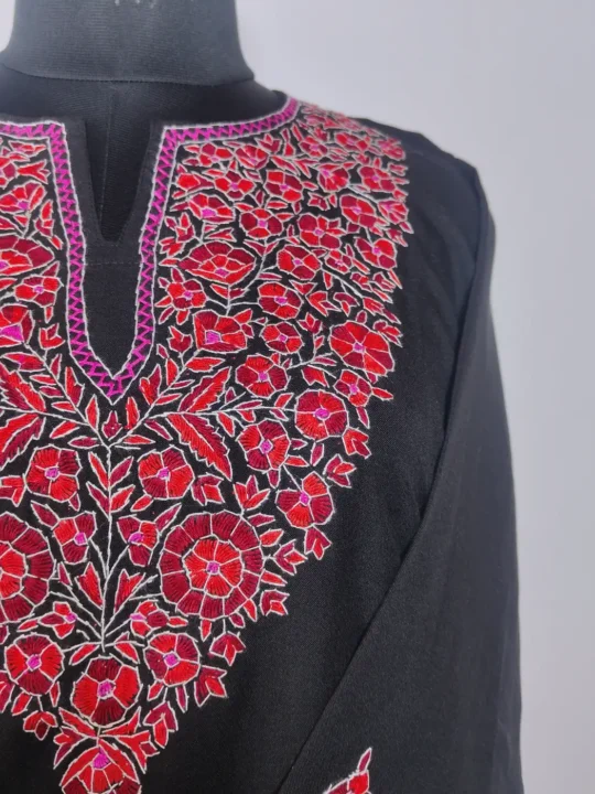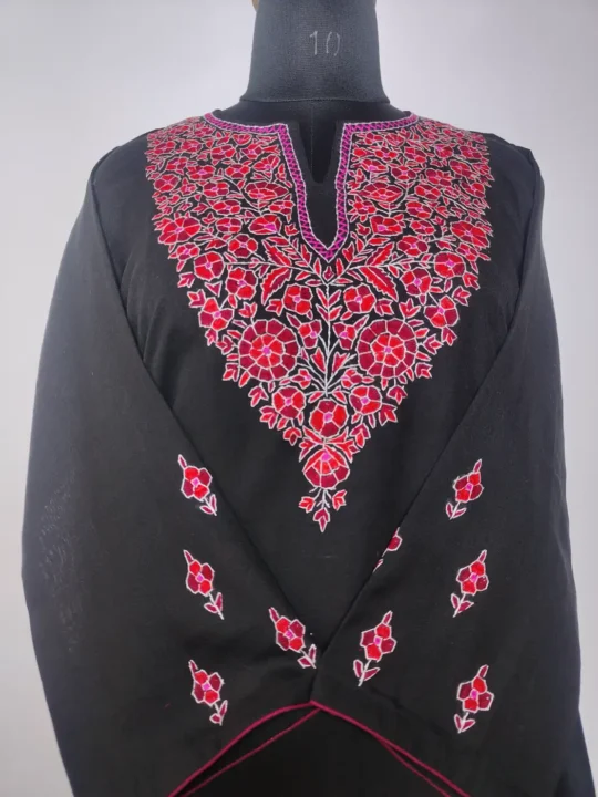 A calm black base defines this Kashmiri kurti set. It is enhanced with hand sozni embroidery. Floral motifs sit at the neckline, while sleeves show fine booti work.