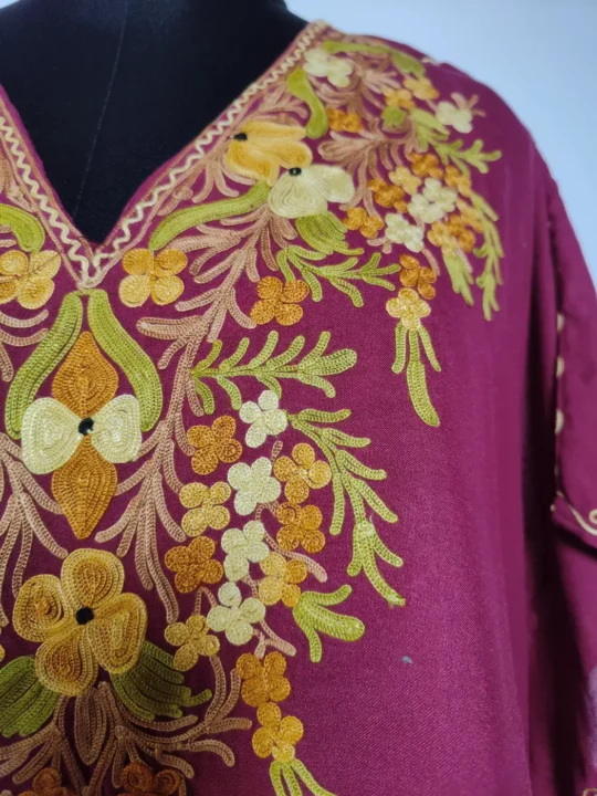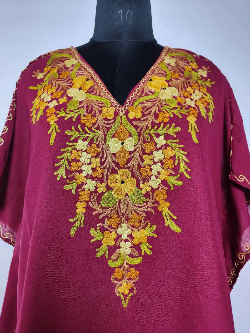 Floral aari embroidery gently highlights the neckline of this Kashmiri kaftan, it is set against a maroon summer cool cotton base. It feels light and easy to wear, offers a relaxed fit that carries both comfort and a quiet traditional charm.