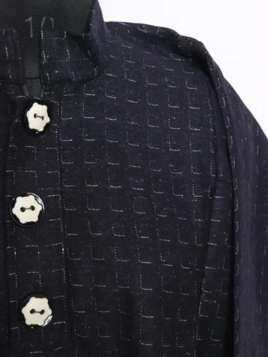 A navy blue traditional kashmiri phiran dress in Tweed wool, finished with pockets on right side for useful storage, reads neat and purposeful. This pheran makes a sensible winter piece that reflects Kashmiri taste without excess, it is ideal for everyday wear.