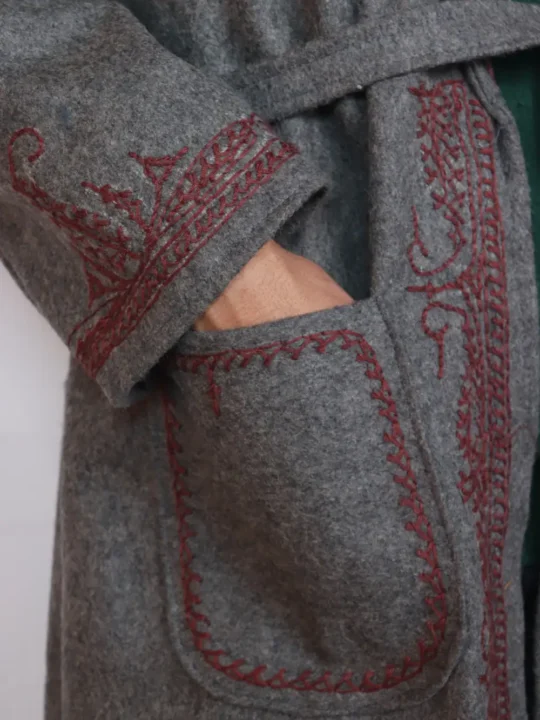 A grey hue aari embroidery gown in tweed wool shows hand-stitched floral aari embroidery at collar, pockets and sleeves. It also has belt with it that provides customizing fit.