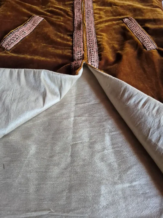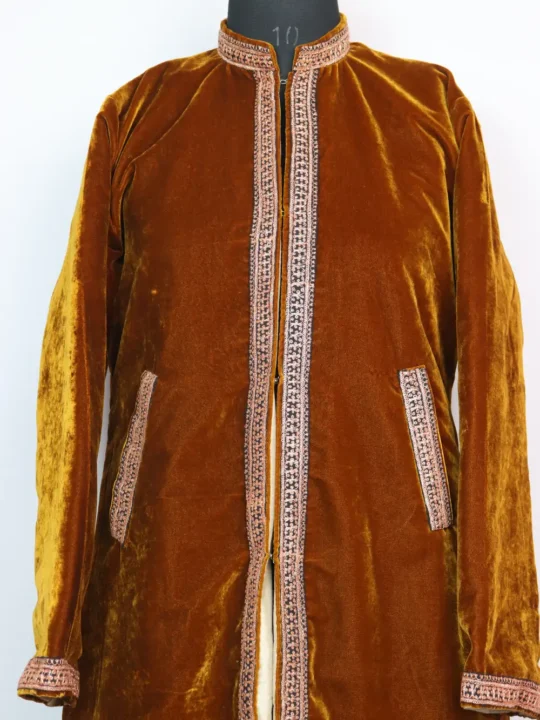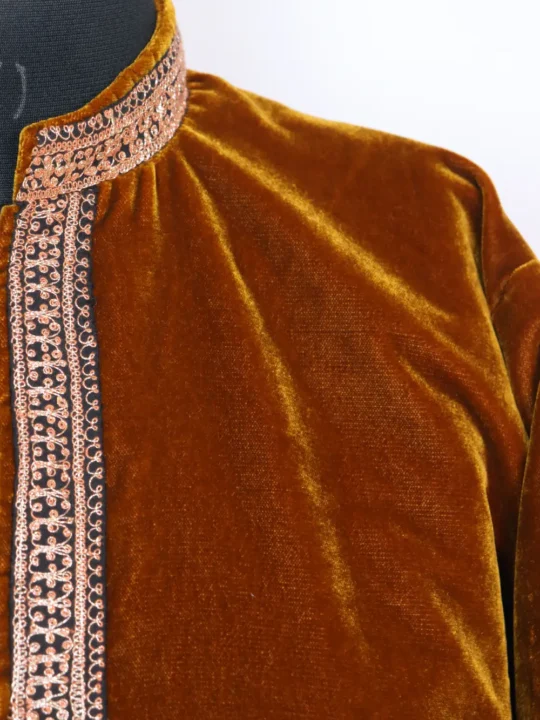 Crafted in plush velvet and raw silk lining, this Premium Coat carries continuous Botte Tilla vine embroidery along the borders in a refined brown tone. It has lining and both side pockets included for premium wear. This coat comes in 42 inch chest and 38 inch length and it feels structured yet soft. Rich border work gives a subtle Kashmiri signature suited for upscale events — a premium piece that blends warmth, polish, and Kashmiri elegance.