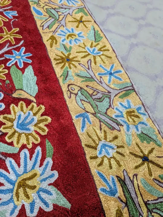 Made in dusoot cotton and measuring 5×3 feet, this red color Kashmiri wall hanging showcases the finesse of chain stitch embroidery. Tree of life pattern spread beautifully across the entire surface, and a dome-style form crowns the upper part of the design. It is decorative and unique, it adds depth and color to spaces while carrying Kashmiri artistic traditions forward.