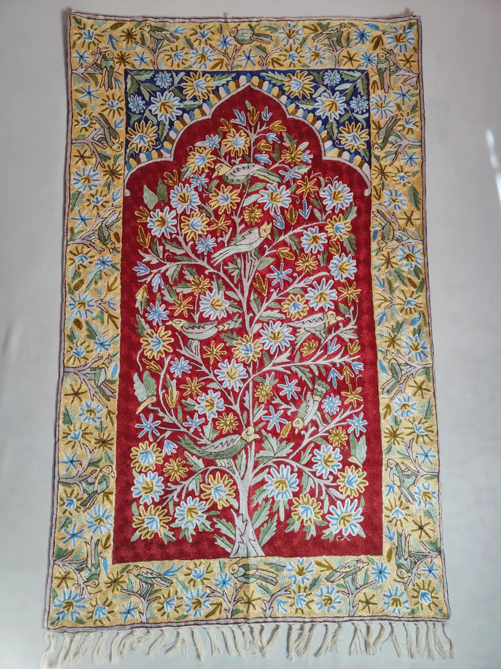 Made in dusoot cotton and measuring 6×3 feet, this red color Kashmiri wall hanging showcases the finesse of chain stitch embroidery. Tree of life pattern spread beautifully across the entire surface, and a dome-style form crowns the upper part of the design. It is decorative and unique, it adds depth and color to spaces while carrying Kashmiri artistic traditions forward.