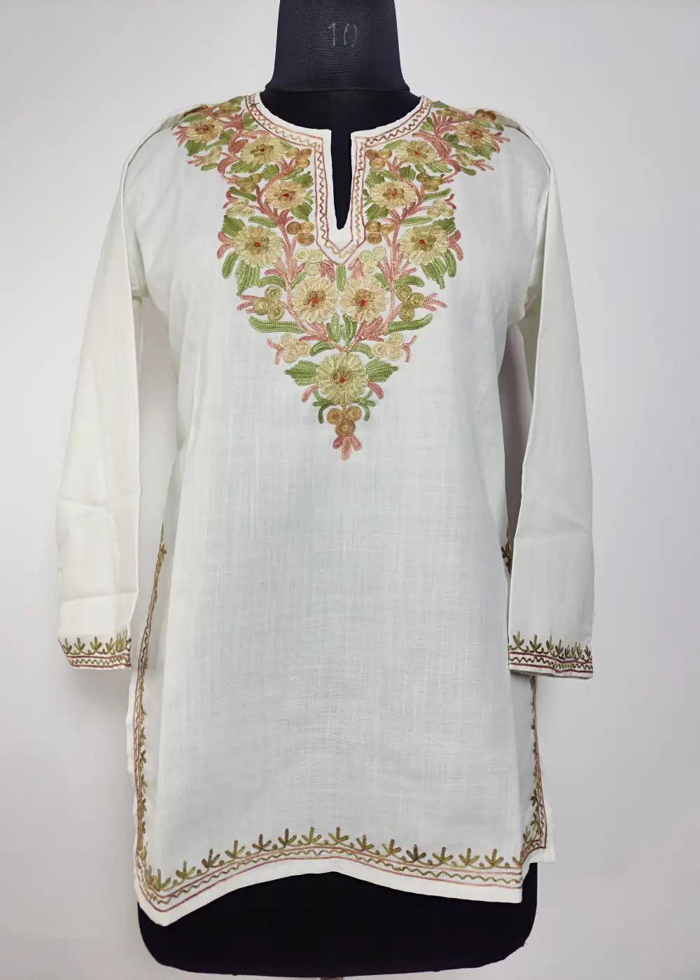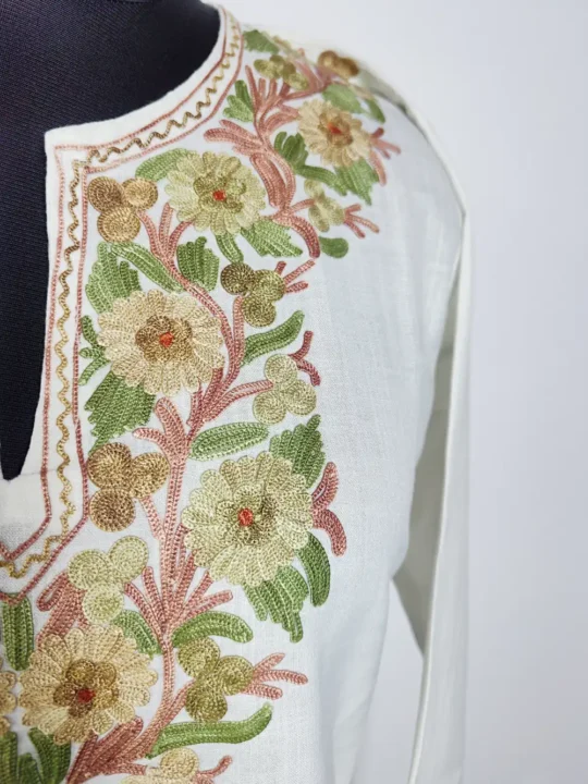 A short cotton kurti with aari embroidery done in floral pattern around the neck that gives it a elegant look. The fabric helps keep you cool and relaxed in heat. It looks nice with jeans and is a perfect pick from cotton kurti for girls and best short kurtis online.