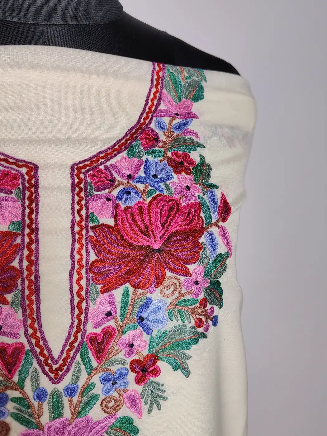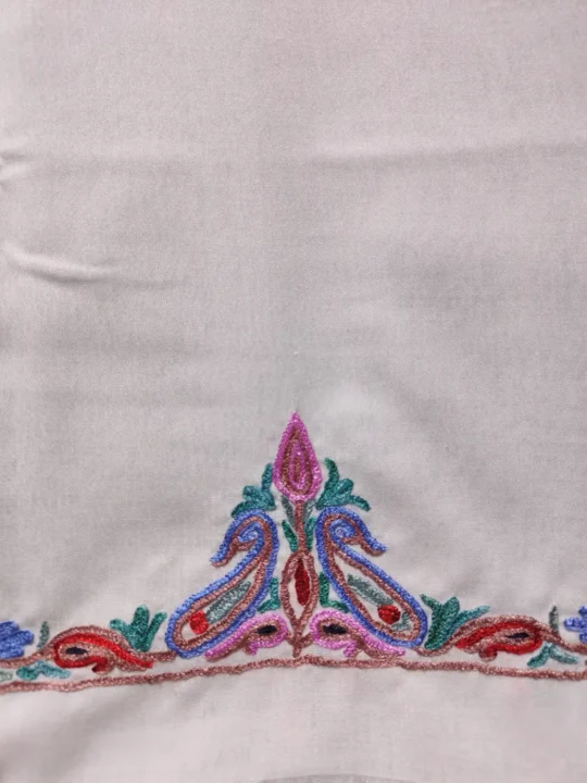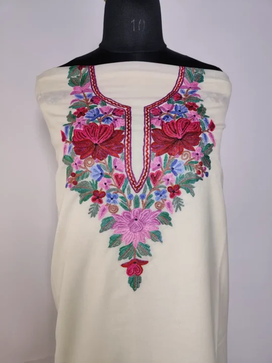 Designed in white summer cool cotton, this Kashmiri kadai suit 2pc piece features floral embroidery at the neckline. The unstitched salwar and kameez gives you full flexibility in tailoring, while the aari work adds just enough detail to keep it elegant and wearable.