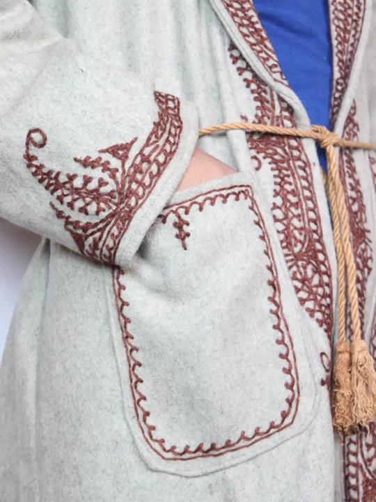 Winter gown for men is crafted in tweed for a warm Kashmiri feel, it has been adorned with floral Aari embroidery gracing the collar. It carries chest 48 and length 49 inches, offering a composed silhouette suited to calm winter days.