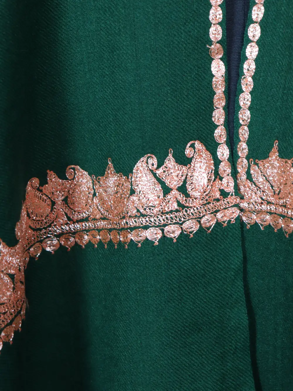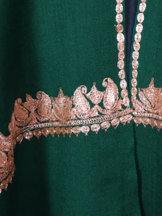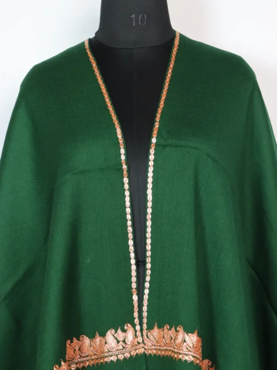 Pure wool green colour Stole for women with continuous Bottle Tilla embroidery around the border in badam motifs executed in golden-hued threads, this Kashmiri Stole carries a rich, refined shimmer. The Stole layers beautifully over all outfits and its kadhai shows at every fold
