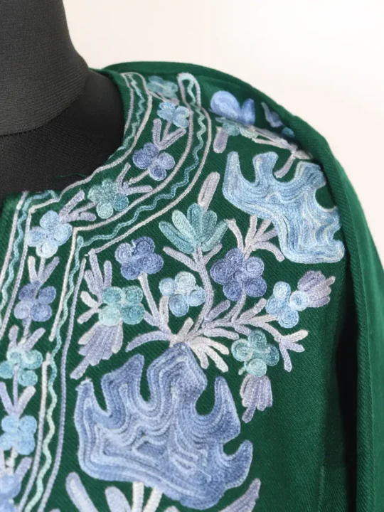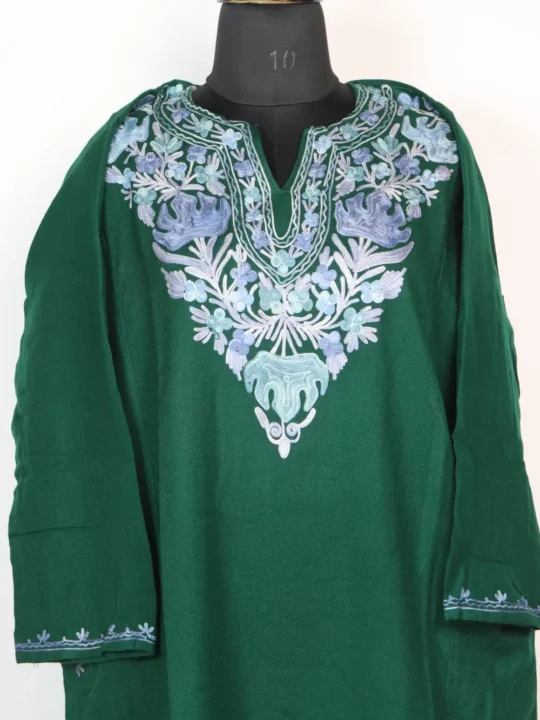 Cashmilon wool and chinar Aari at the neckline come together on this Kashmiri Pheran — light on detail yet warm for the season. This Pheran from Kashmir keeps styling easy while offering elegant neckwork.