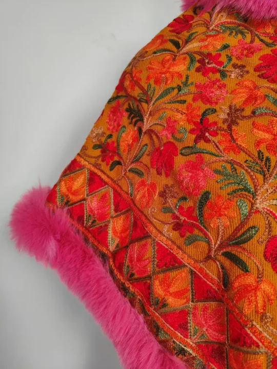 This mustard kids Poncho with pink fur in Cashmilon Wool carries Aari kaam k flowers in red, orange and brown and green hue motifs all over the body, that gives it a decorative surface that still reads soft and wearable. It is sized at 29-inch chest and 22-inch length, it offers good coverage for girls and keeps them warm. Families often refer to such layers as garam suits when shopping. This fur Poncho blends warmth and floral stitchwork for a comfortable Kashmiri winter pick.