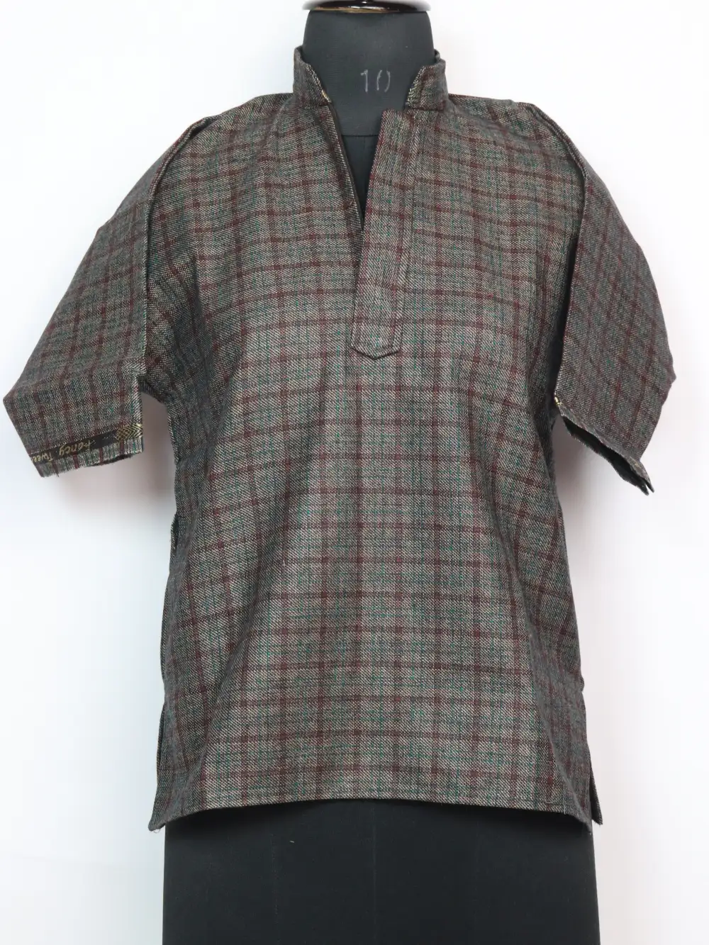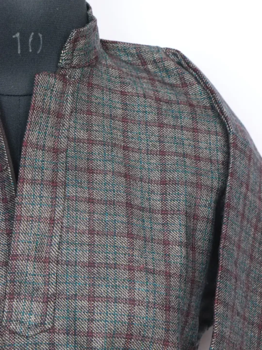 A tidy grey Kashmiri phiran dress in Tweed wool, it is practical with pockets on right side and adorned with check patterns. The phiran kashmiri dress fits well into daily rotation and provides a discreet Kashmiri tone that complements plain trousers and shawls.