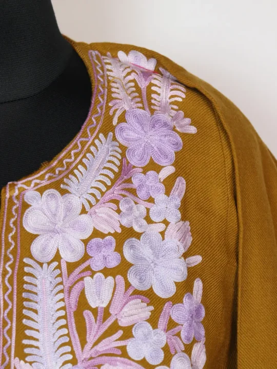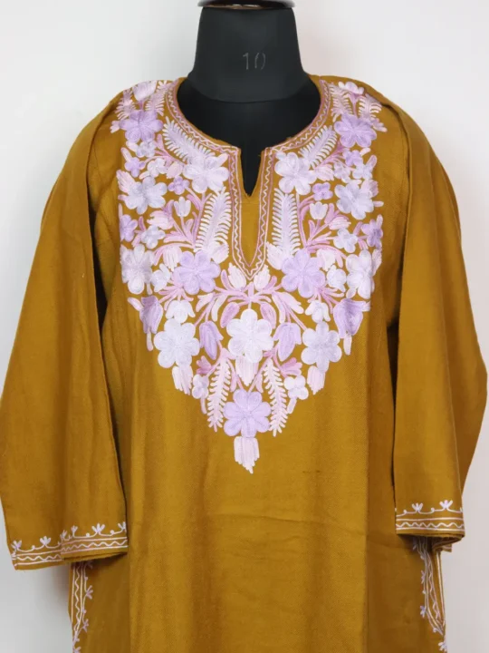 A mehndi green Kashmiri pheran in Cashmilon Wool shows Aari embroidery at the neckline in lavender floral motifs. It includes pockets on both sides for everyday ease. It is warm, modest and ready to wear.