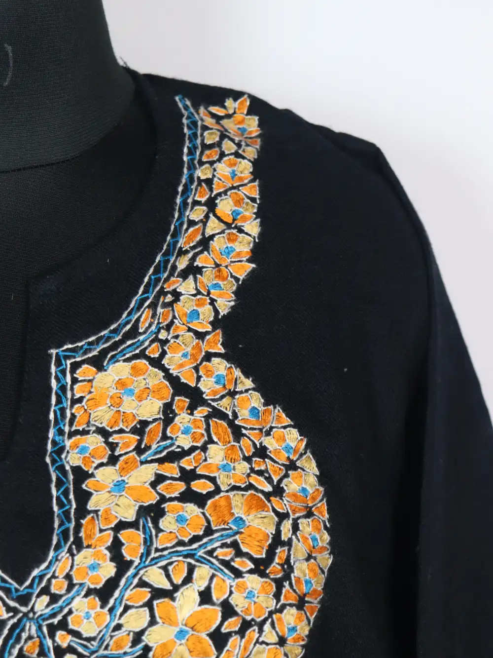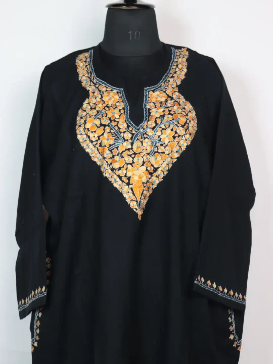 Black colour Kashmiri pheran in raffal wool carries sozni and paper machie embroidery at the neckline. It has been thoughtfully fitted with pockets on both sides so it combines utility and understated charm so you can wear it as a dependable winter staple.