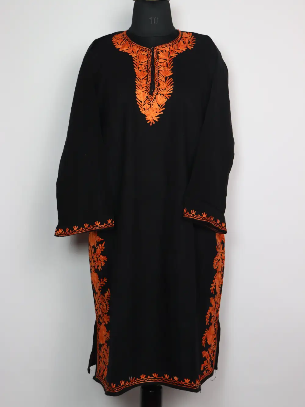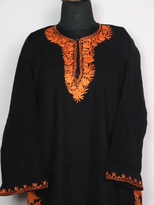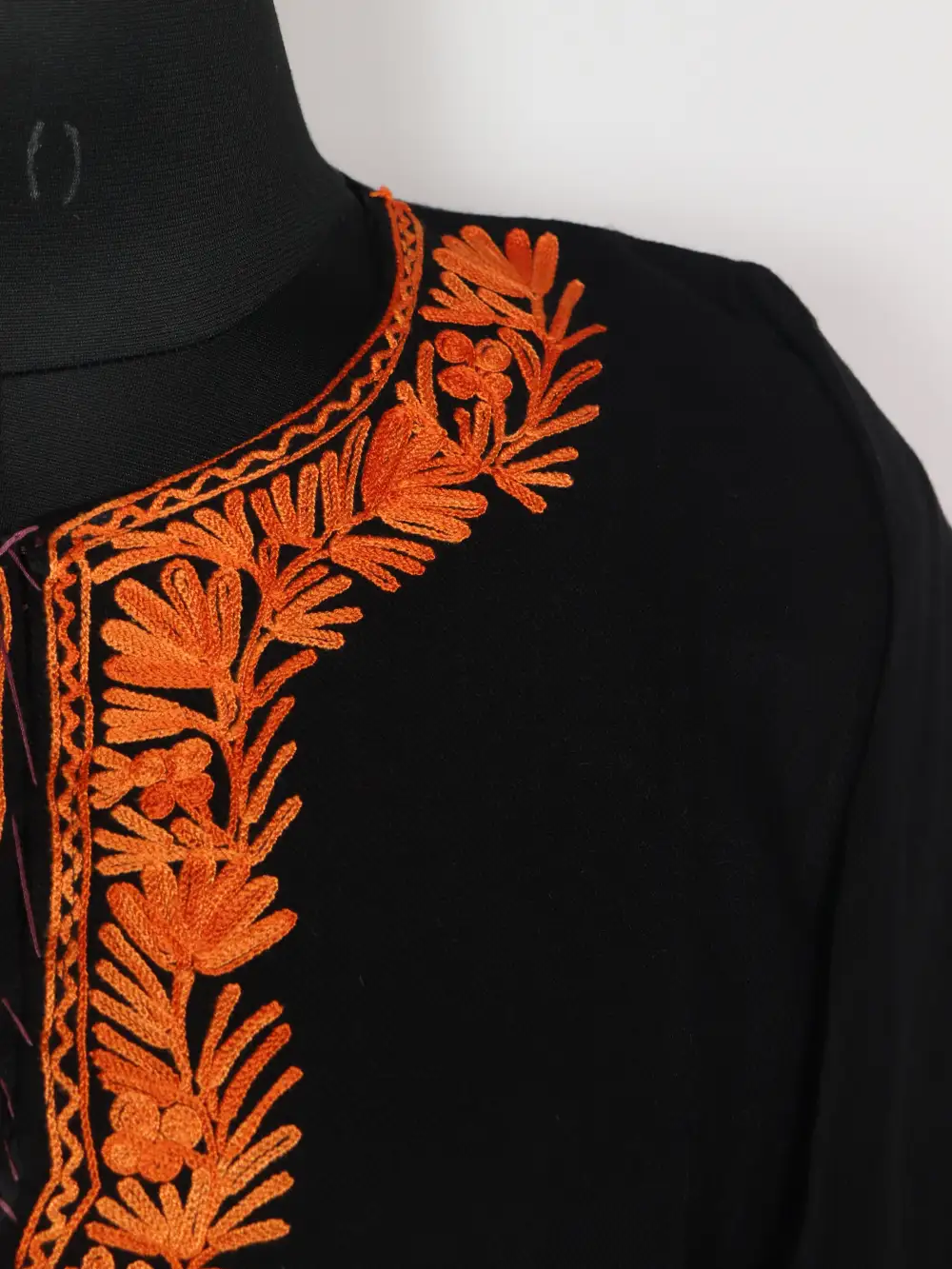 Made in cashmilon wool fabric, this black pheran offers Aari embroidery in continuous floral at neckline and bootis on side borders. It includes pockets on both sides to keep essentials handy.