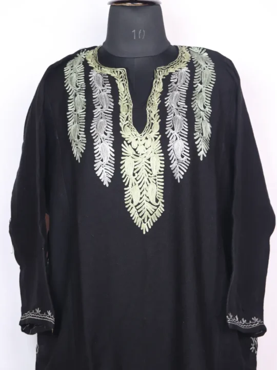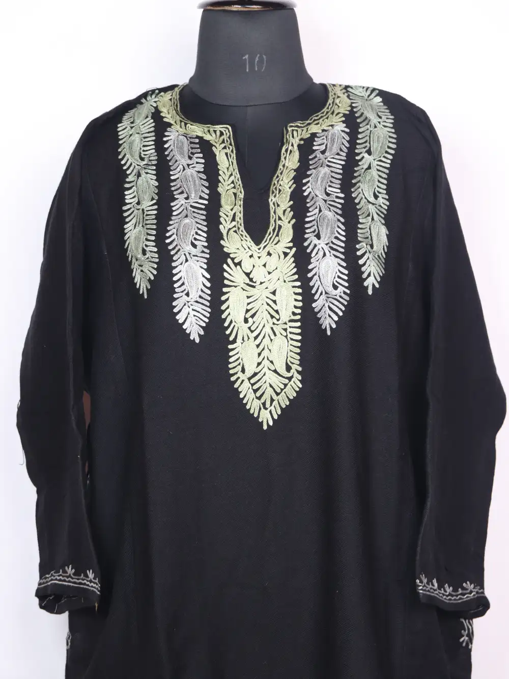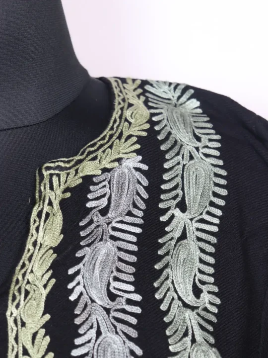 A carefully finished black Kashmiri phiran dress in Cashmilon wool, decorated with Aari floral work at the neckline in lavender floral patterns. Its practical pockets on both sides enhance everyday usability while the tailored fall keeps the look neat.