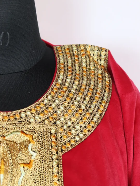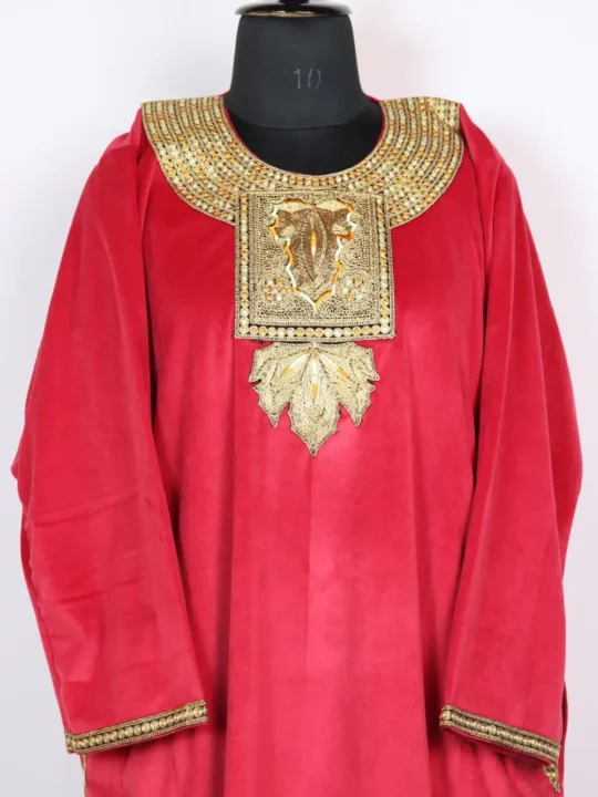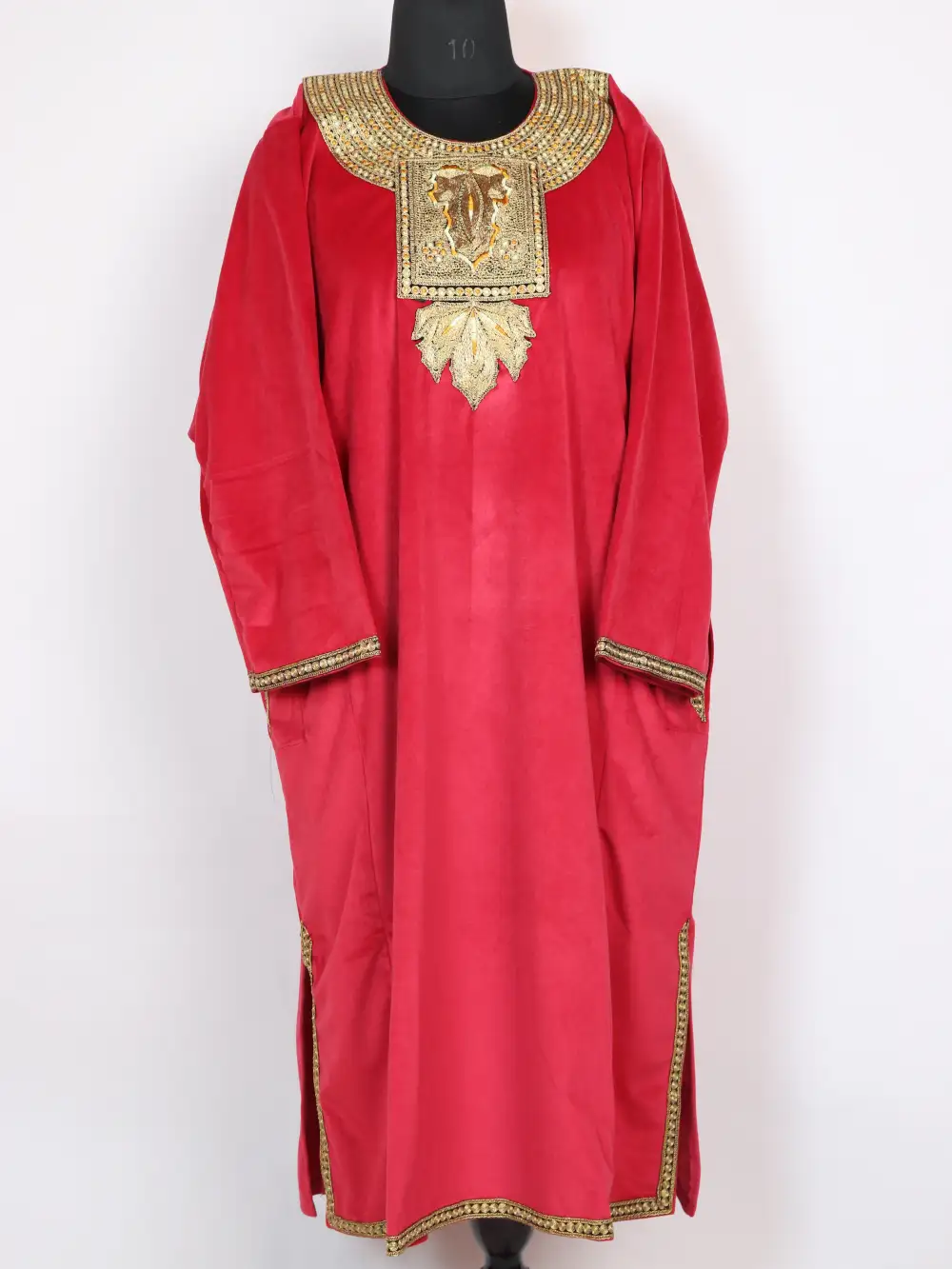 This pink Kashmiri Pheran features Makmal (Velvet) with golden tilla kadhai at neckline which showcases huge chinar motif under the beautifully embroidered box style. Its two side pockets enhance practicality, and the 56-inch chest with 45.5-inch length ensures a perfect fit. This phiran blends winter warmth with refined detailing, that creates an elegant piece suitable for cold days, and it doubles as a stylish phiran Kashmiri dress.