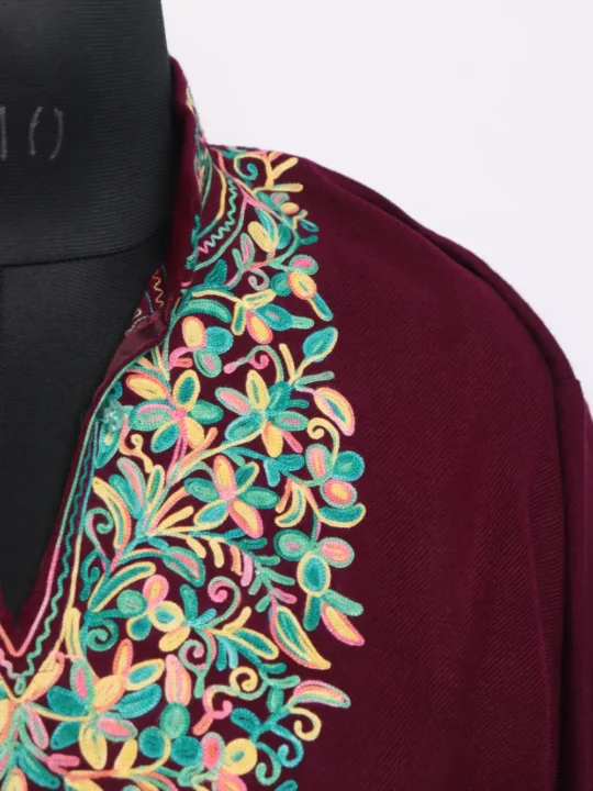 Magenta colour Cashmilon Wool dresses this beautiful long kurti with floral Aari around the neckline; It comes with chest size 46 inches and Length 39 to ensure a comfortable fit.