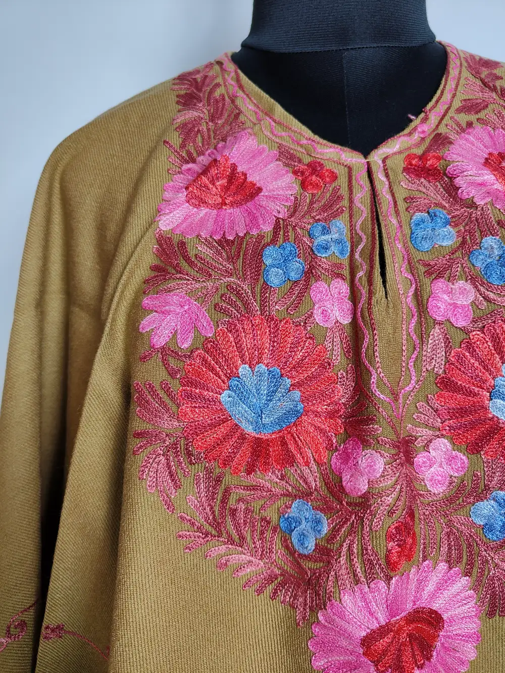 A brown Kashmiri embroidered poncho in Cashmilon wool, adorned with floral Aari at the neckline and continuous near-border embroidery. Side-by-side it is 64 inches and it is 31 inches long.