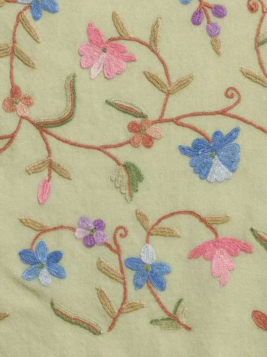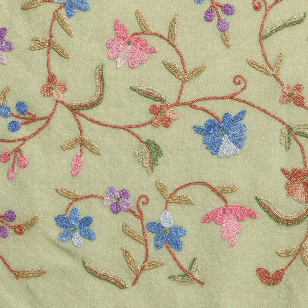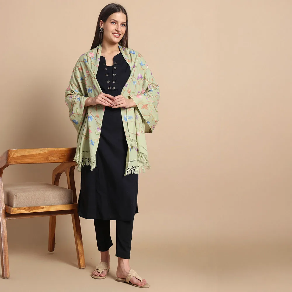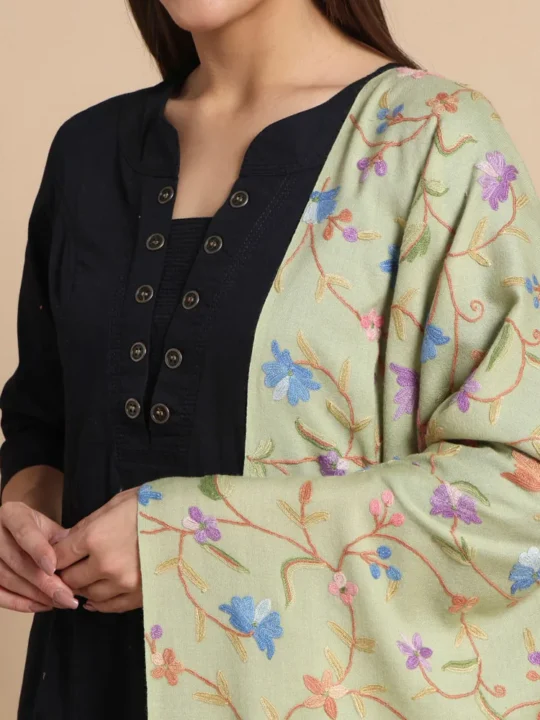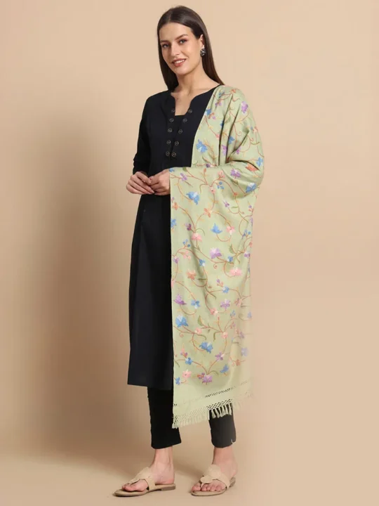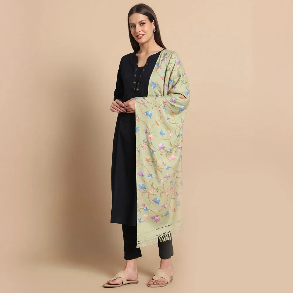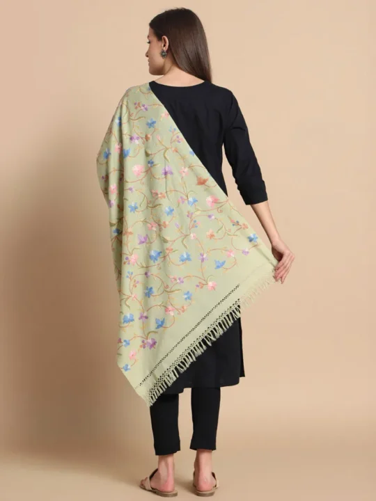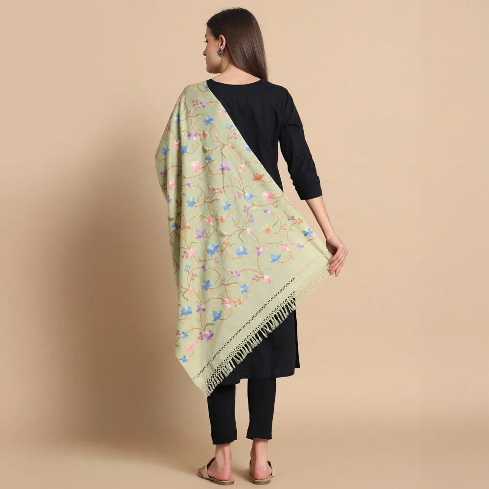 Step into elegance with our Light Green Hand Aari Embroidered Wool Stole, a masterpiece of Kashmiri craftsmanship that blends tradition with sophistication. Crafted from 100% pure wool, this stole features exquisite floral and bird designs, making it a timeless accessory for women who value artistry and quality.