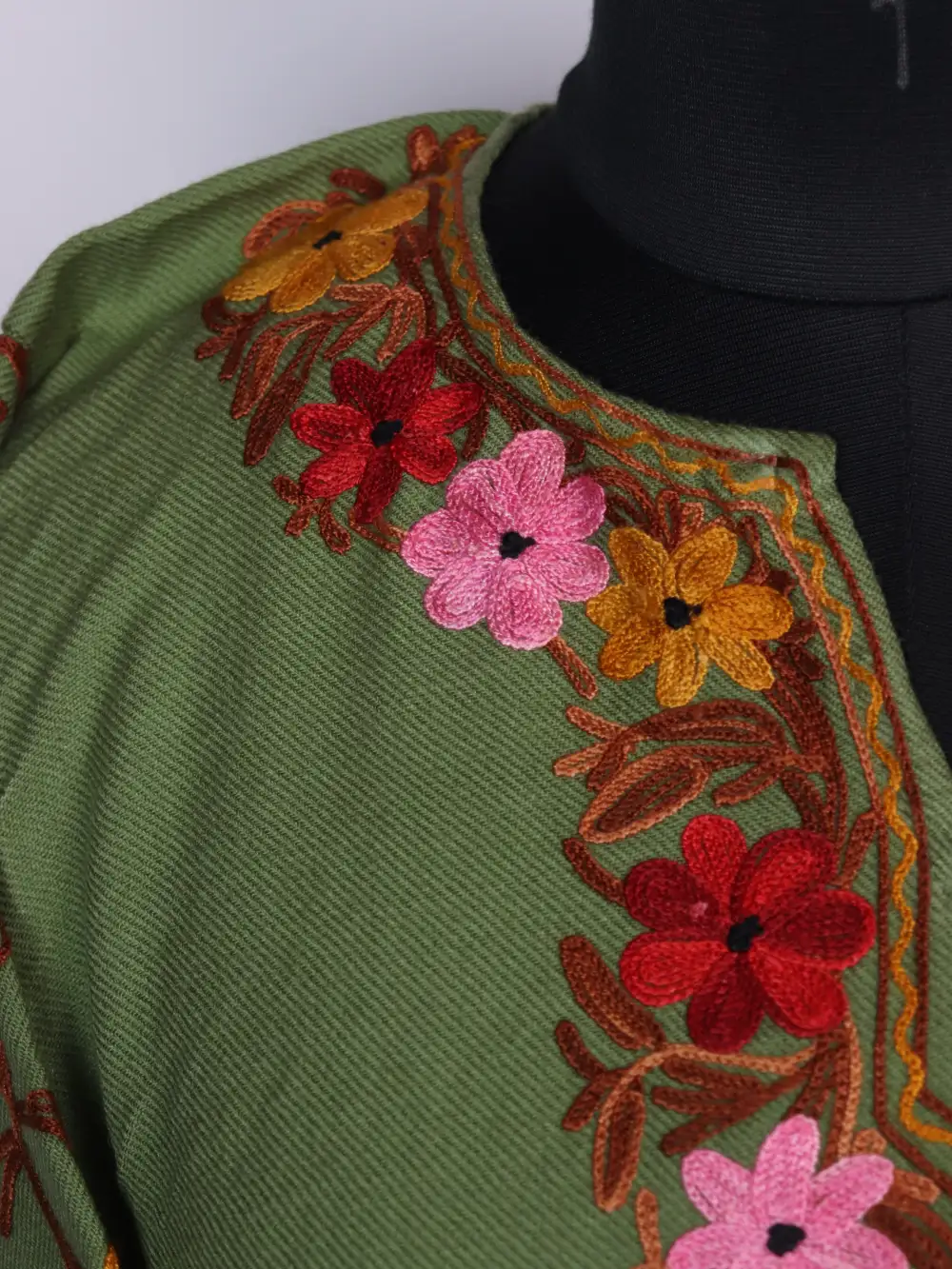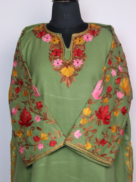 This light green feran comes with smooth cashmilon wool with clean posh bagh aari detailing around the neckline and jaal embroidery on the sleeves, giving it a stylish finish.